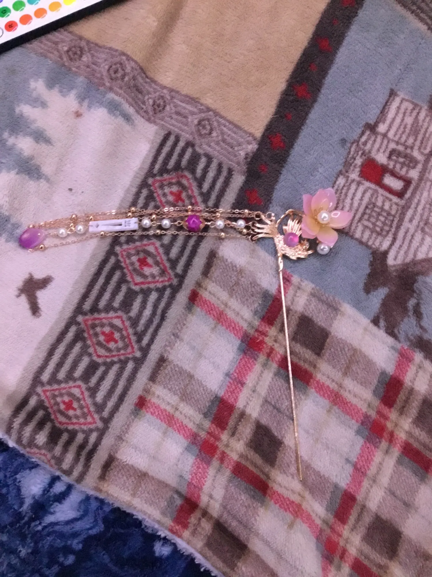 Это's очень красиво, я люблю цвета и то, как кисточки свисают. Цветок очень хлипкий, поэтому я должен быть очень осторожен. Палка также кажется, что она может сломаться, если у вас густые волосы. Я haven't попробовал это еще, но у меня есть пара идей наряд для него. Пришло раньше, чем ожидалось, так что это плюс.