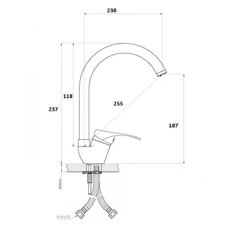 Смеситель для кухни боковой однорукояточный, картридж 35мм. Материал корпуса - цинковый сплав. Рукоятка с отверстием. Высокий поворотный излив D24мм. Способ крепления к раковине - 2-е шпильки. Покрытие корпуса - хром.