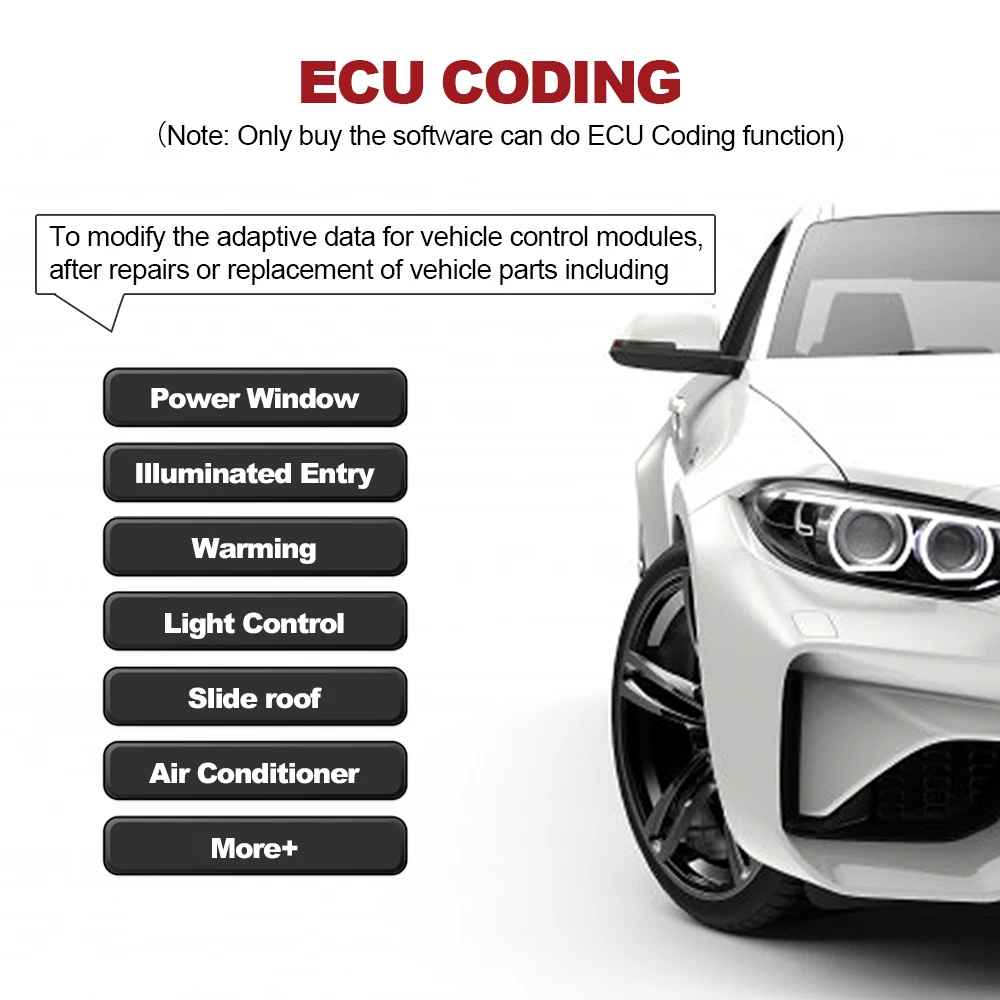 Функция кодирования используется для повторной вспышки модулей управления транспортным средством. Используется для перепрограммирования адаптивных данных для модулей управления транспортным средством после ремонта или замены деталей транспортного средства; Предоставляет решения для проблем, связанных с drivable, топливной эффективностью, потерей мощности, кодами неисправностей, долговечность механических деталей и т. Д.; Тормозит ограничения и ограничения; Полностью Используйте скрытые функции автомобиля, например, меняйте Куранты на автомобиле, устанавливайте, сколько раз мигает сигнал one-touch одним касанием, помните настройки для систем Start/Stop, И многое другое.
