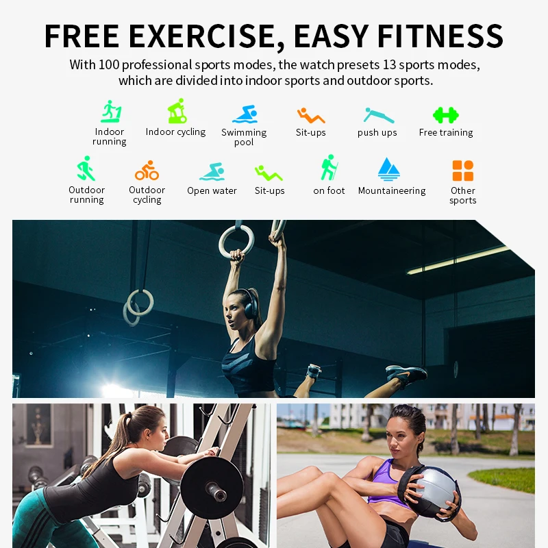 Это мощный фитнес-трекер. Переключение 8 различных спортивных режимов непосредственно на часы. Встроенный усовершенствованный 3D-датчик и шагомер для точного подсчета ваших шагов, сожженных калорий и пройденного Расстояния. Точно записывайте активность в течение всего дня, чтобы помочь вам лучше контролировать различные тренировки. Различные виды спорта: бег в помещении, езда на велосипеде в помещении, плавательный бассейн, сидения, пуш-ап, бесплатное обучение,Открытый Бег, Открытый Велоспорт, сидения, пешком, альпинизм