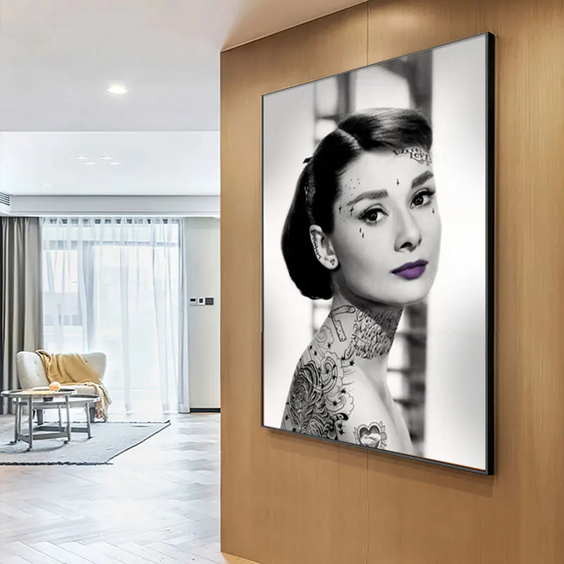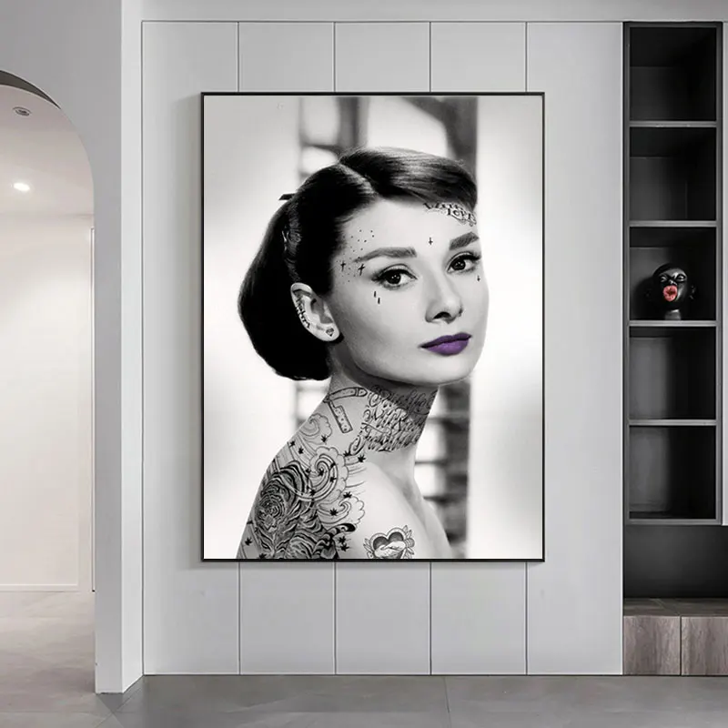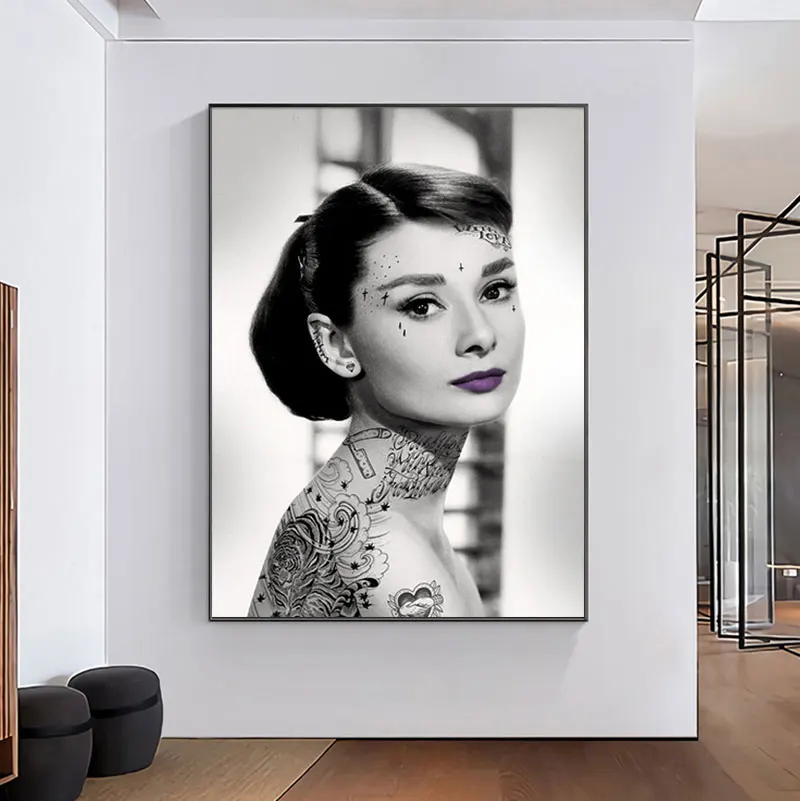 Модные татуировки Одри Хепберн портрет, холст, живопись черный и белый плакат Скандинавская Настенная картина Декор для гостиной