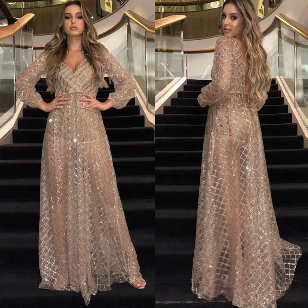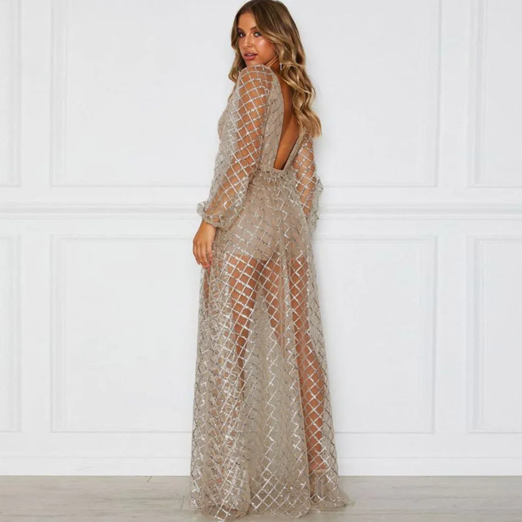 Женское платье-макси с V-образным вырезом, длинным рукавом и открытой спиной