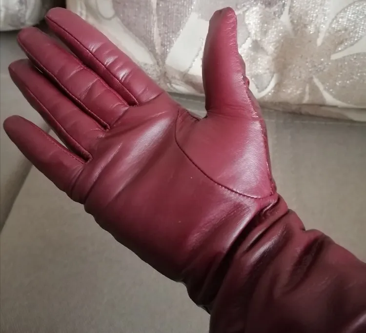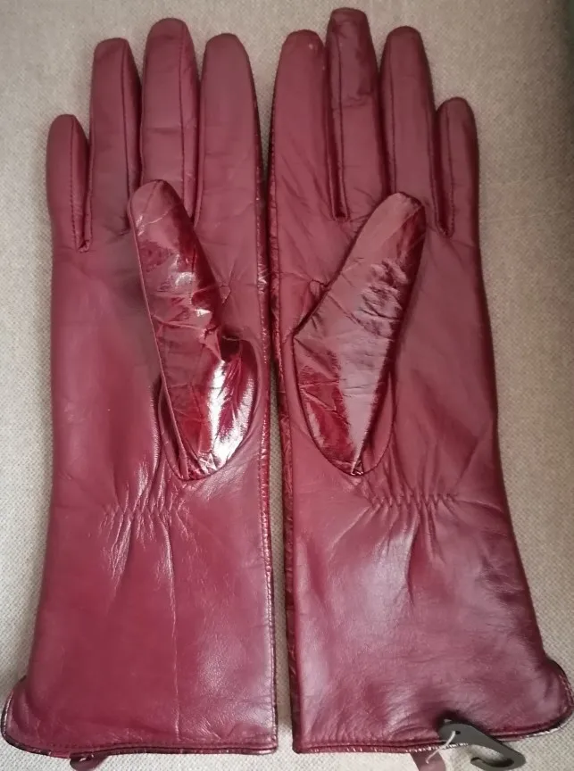 Доставка 23 дня. В принципе, перчатки не плохие, но присутствует сильный запах. Надеюсь выветрится. Кожа с внутренней стороны мягкая тонкая, на тыльной стороне ласковая кожа, она более жёсткая. Перчатки высокие, внутри тонкий флис, размер соответствует таблице. Цвет спелой вишни, на фото получились светлее. Сели хорошо кроме пальцев, длинноваты. Зачем делать такие длинные пальцы в перчатках, особенно на безымянном?