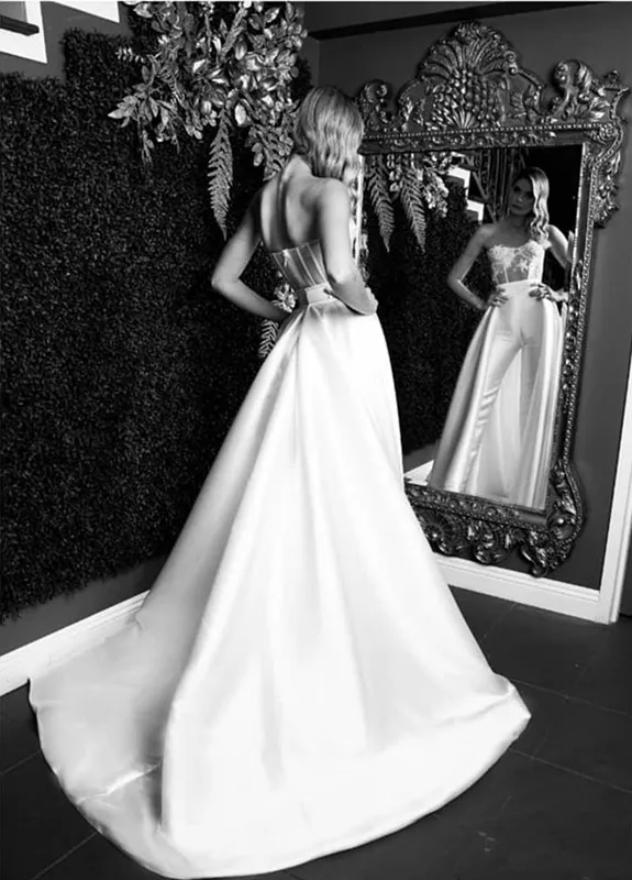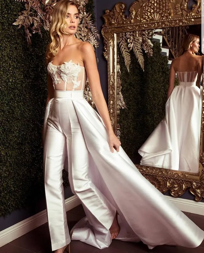 Кружевной свадебный комбинезон со съемным шлейфом, 2021, современное праздничное пляжное платье невесты без бретелек, с открытой спиной и брючными костюмами