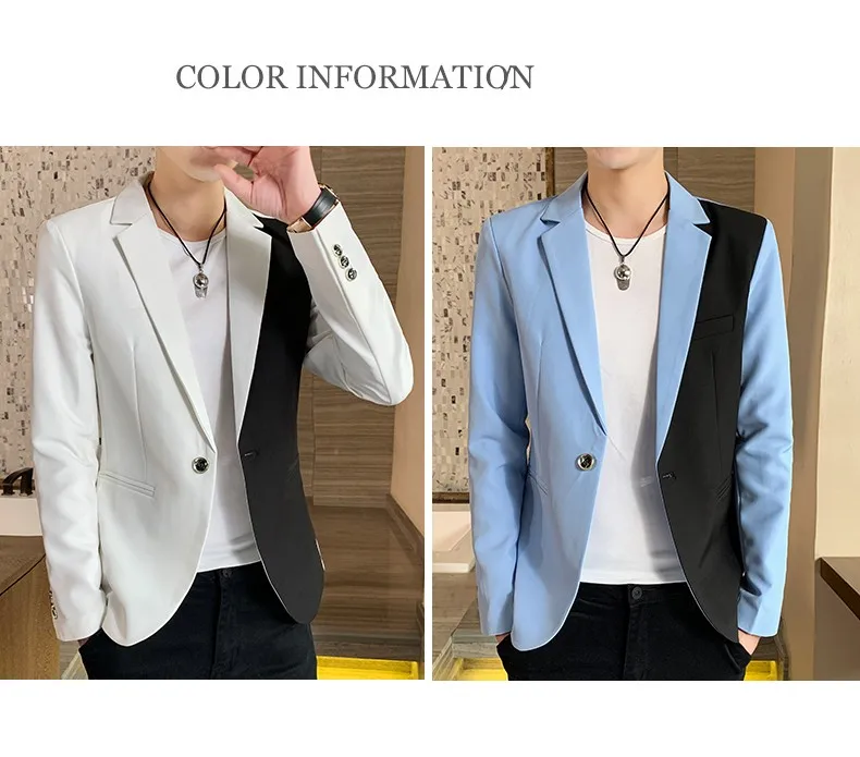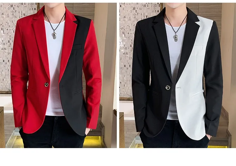 Мужской повседневный Блейзер, корейская модная одежда, лоскутный костюм, куртка, Мужская Летняя тонкая красивая одежда, приталенное пальто, красный, белый, синий