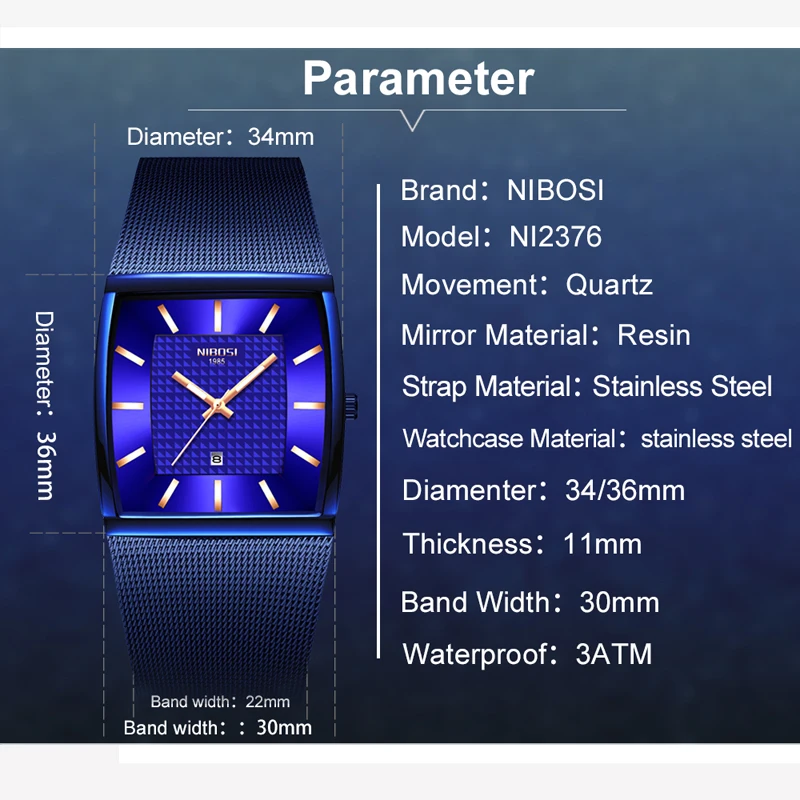Часы NIBOSI мужские, синие, квадратные, кварцевые, тонкие, водонепр...