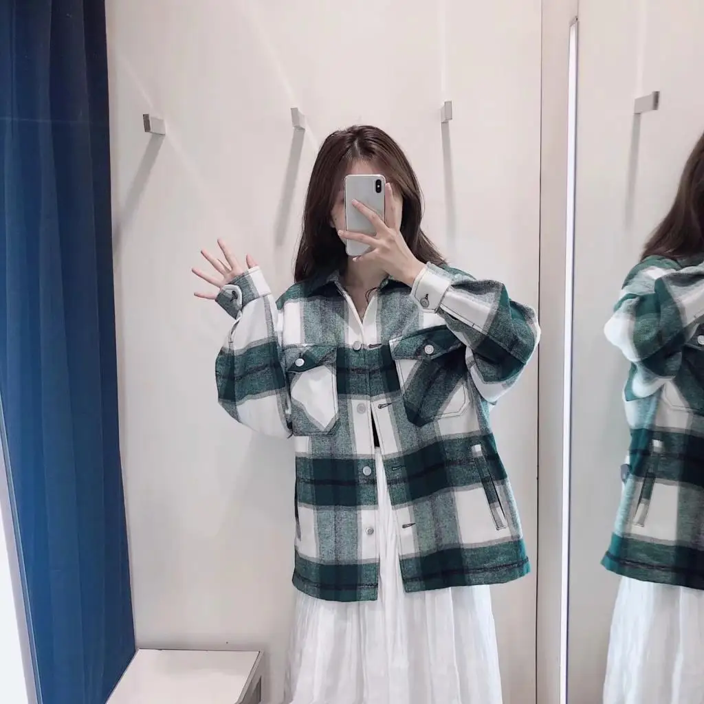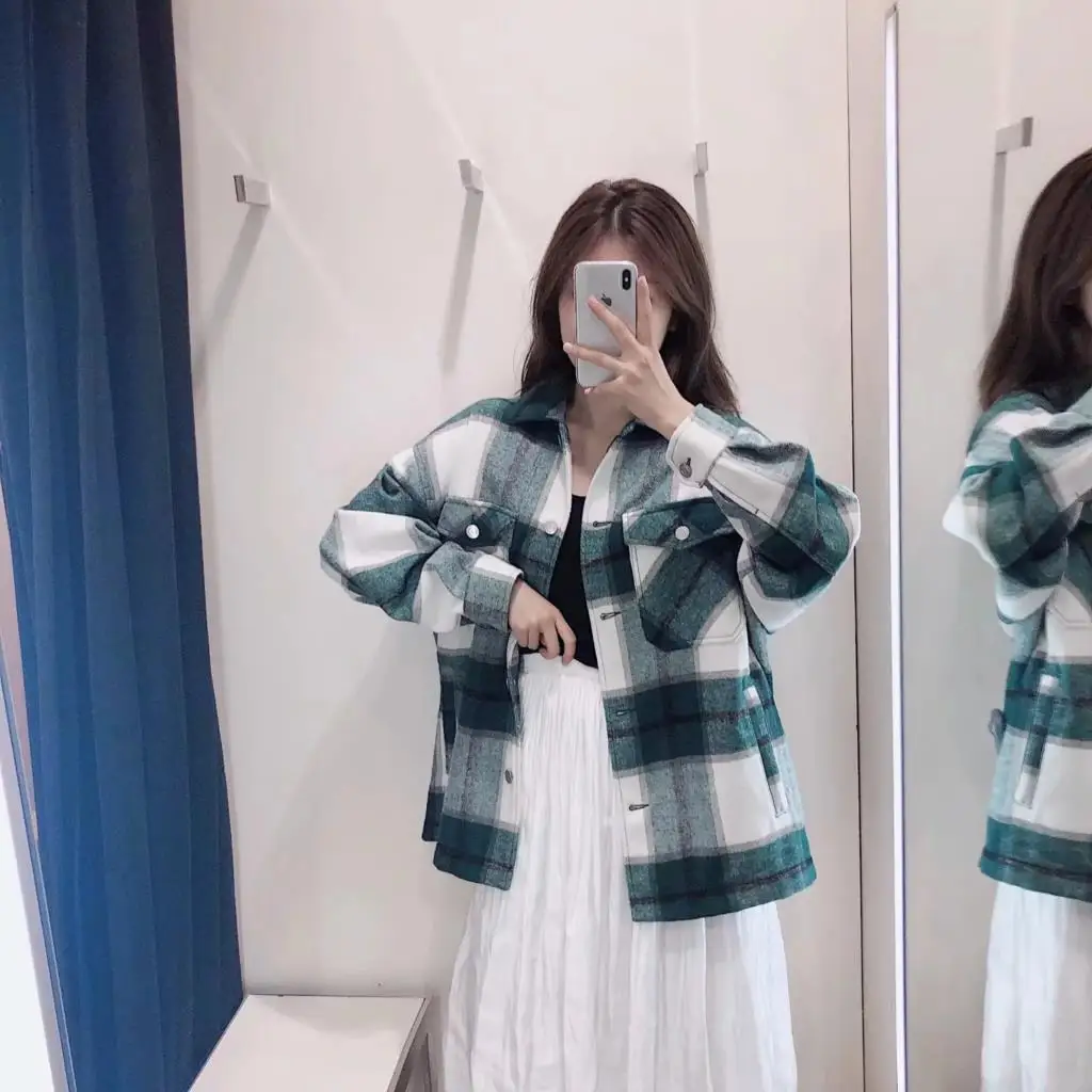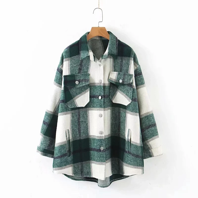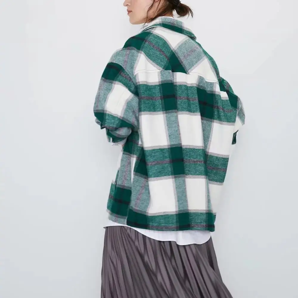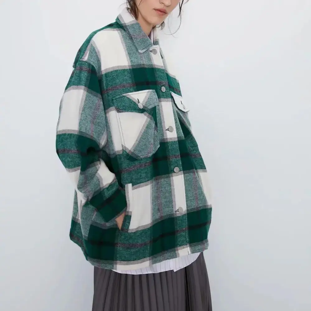 Женская Клетчатая Шерстяная рубашка ZA, твидовое плотное пальто, теплая верхняя одежда, винтажные пальто оверсайз, женская одежда для осени и зимы