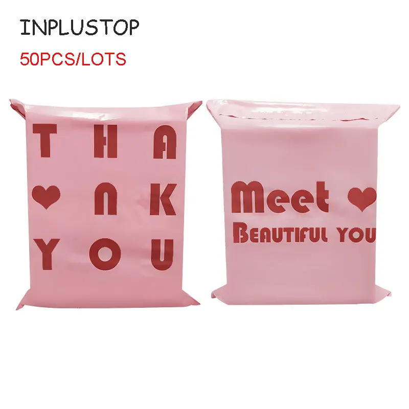 INPLUSTOP, 50 шт.лот, розовые курьерские Сумки, плотные, спасибо, пластиковые пакеты, самозапечатывающиеся конверты, почтовый пакет для одежды