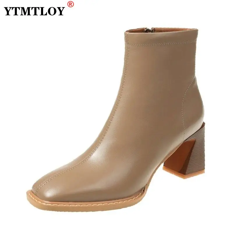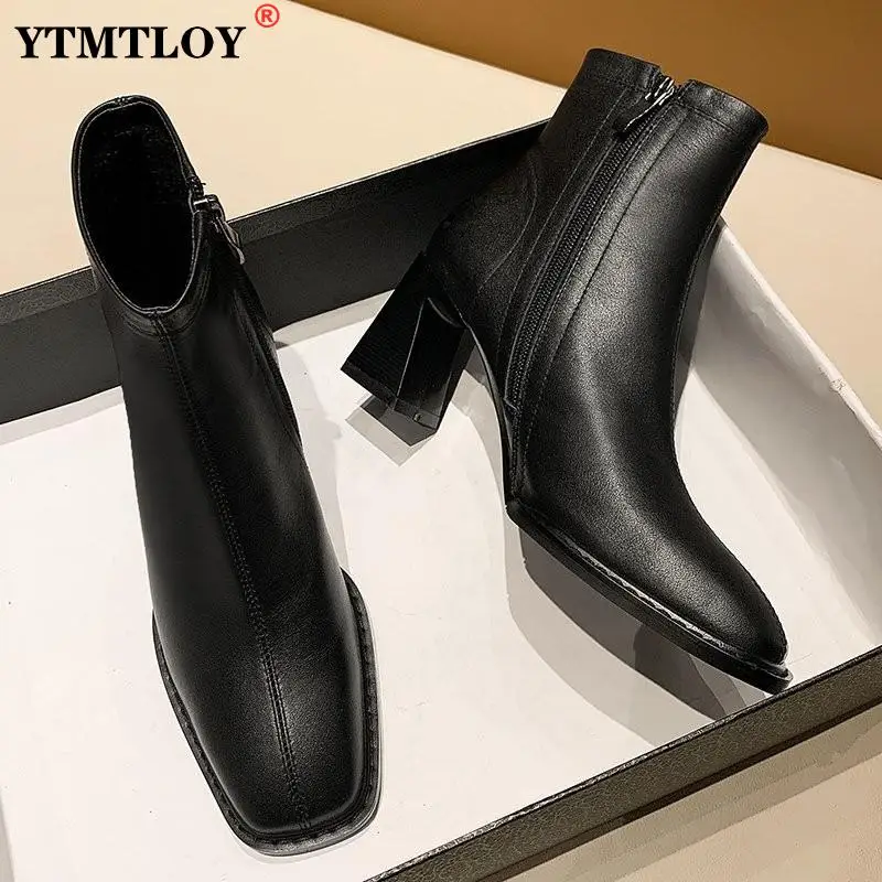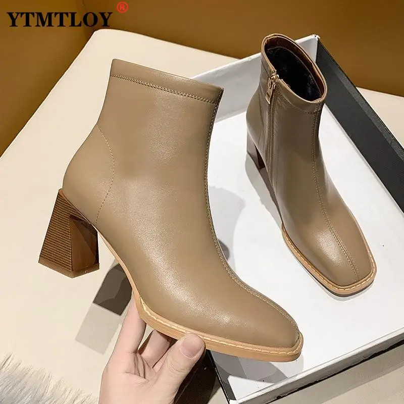 Женские кожаные ботильоны на среднем каблуке, с квадратным носком, ...