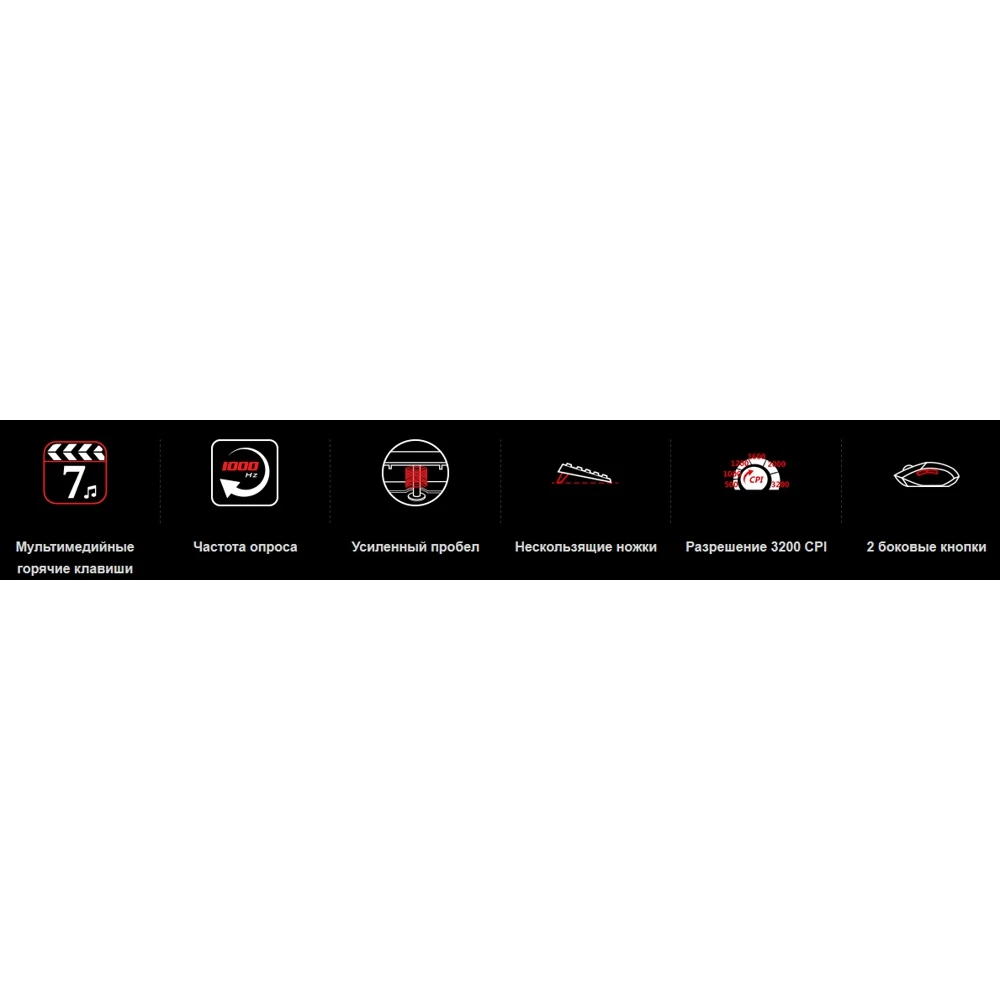 Клавиатура: подсветка, влагозащита, усиленный пробел, ANTI GHOSTING, нескользящие ножки, мультимедийные клавиши, 1000Гц. Мышь: частота опроса 500 Гц, частота кадров 6666 FPS, сенсор AVAGO A3050 Gaming Engine, 3200 CPI, подсветка, металлические ножки.