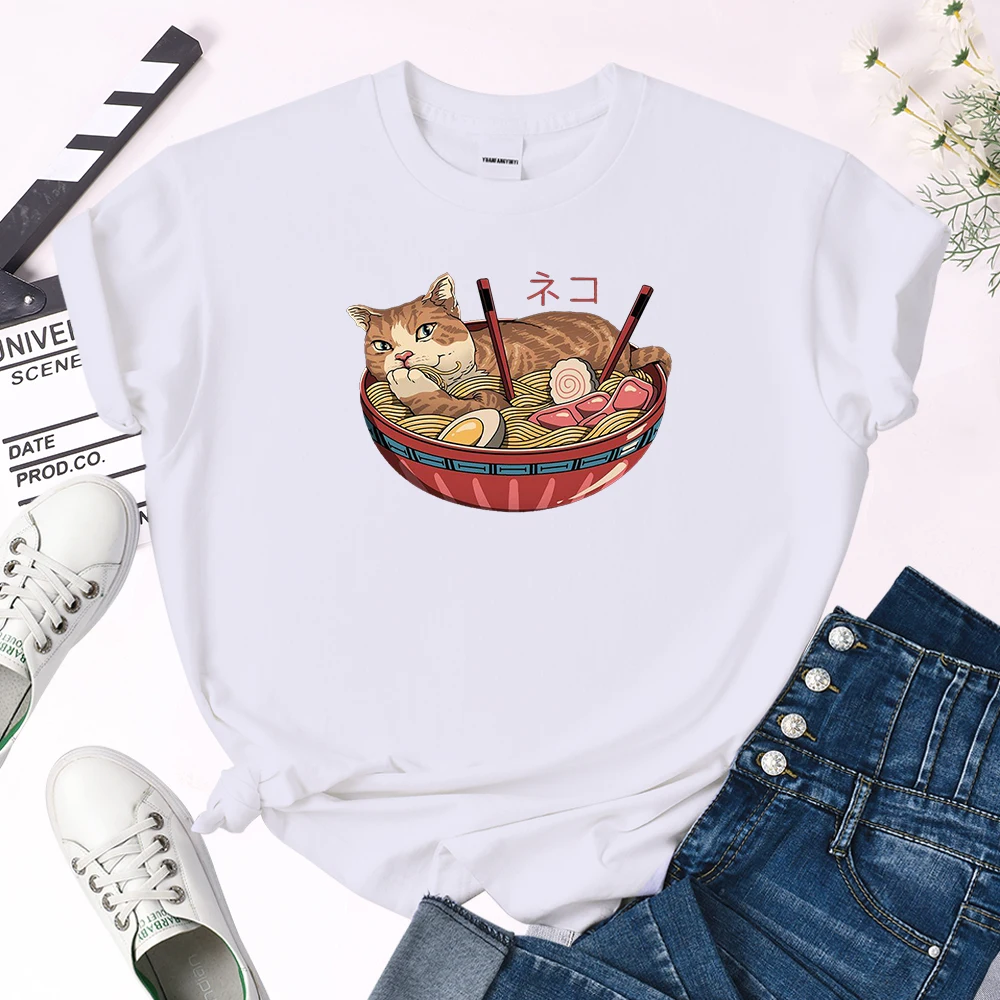Женская футболка с принтом кота, ворующего в миске рамена, в стиле харадзюкуа, мягкая футболка с круглым вырезом, Женская Уютная свободная обтягивающая одежда
