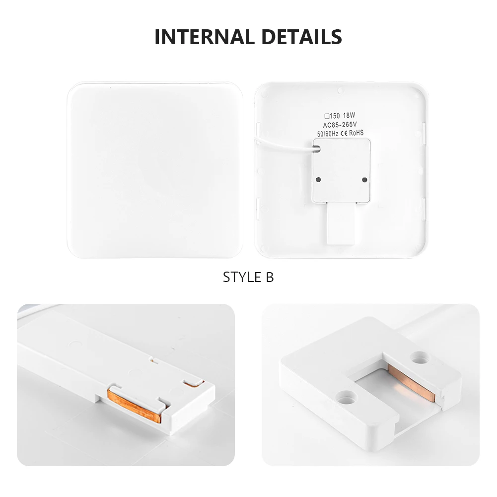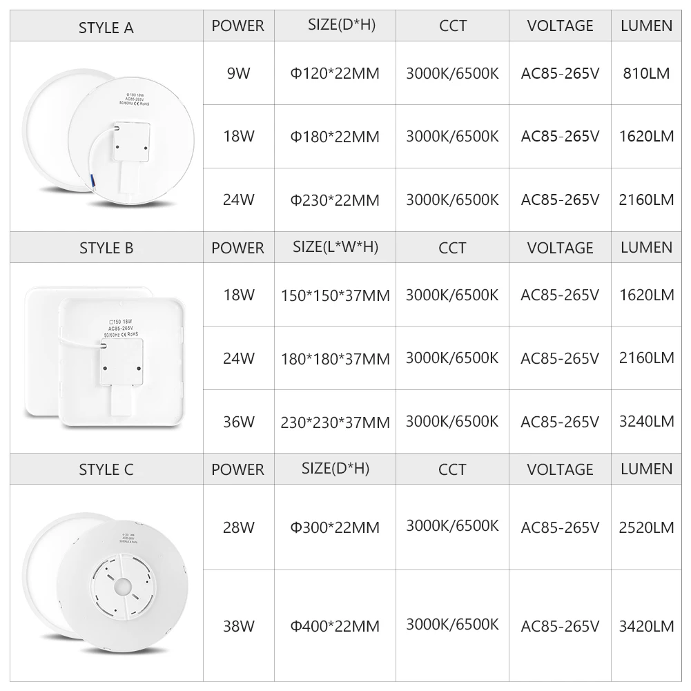 Стиль Мощность Светодиодный индикатор Размеры Люмен Зона молнии Стиль А Круглый 9 Вт 48 шт. 120x2 2 мм/ 4,72x0,86" 810лм 4 ~ 8㎡ 18 Вт 100 шт. 180x2 2 мм/ 7,08x0,86" 1620лм 8 ~ 12㎡ 24 Вт 130 шт. 230x2 2 мм/ 9,05x0,86" 2160 лм 12 ~ 18㎡ Стиль B Квадратный 18 Вт 96 шт. 150x150x3 7 мм/ 5,90x5,90x1,45" 1620лм 8 ~ 12㎡ 24 Вт 130 шт. 180x180x3 7 мм/ 7,08x7,08x1,45" 2160 лм 12 ~ 18㎡ 36 Вт 224 шт. 230x230x3 7 мм/ 9,05x9,05x1,45" 3240лм 15 ~ 20㎡ Стиль C Круглый 28 Вт 160 шт. 300x2 2 мм/ 11,81x0,86" 2520лм 15 ~ 20㎡ 38 Вт 210 шт. 400x2 2 мм/ 15,75x0,86" 3420лм 18 ~ 25㎡