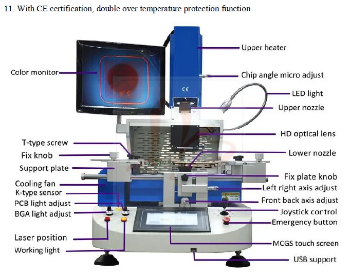 1. Принятие сенсорного интерфейса HD человека-машины; Верхняя нагревательная головка и монтажная головка разработаны 2 в 1; Обеспечение многих видов титана сплава BGA tuyere можно поворачивать в 360 градусов для легкой установки