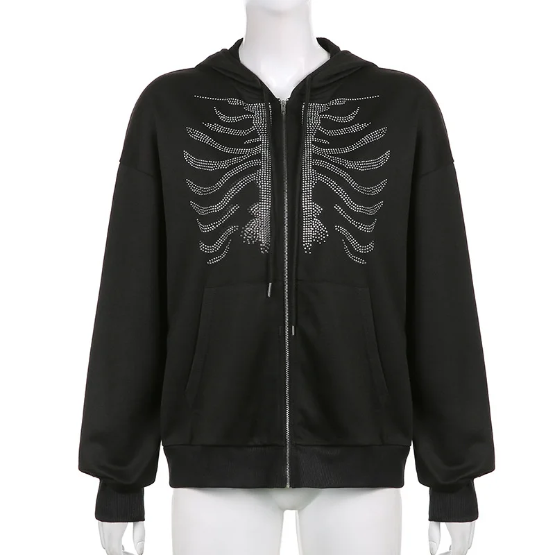Y2K Стразы худи Скелет женские готические гранж на молнии оверсайз ...