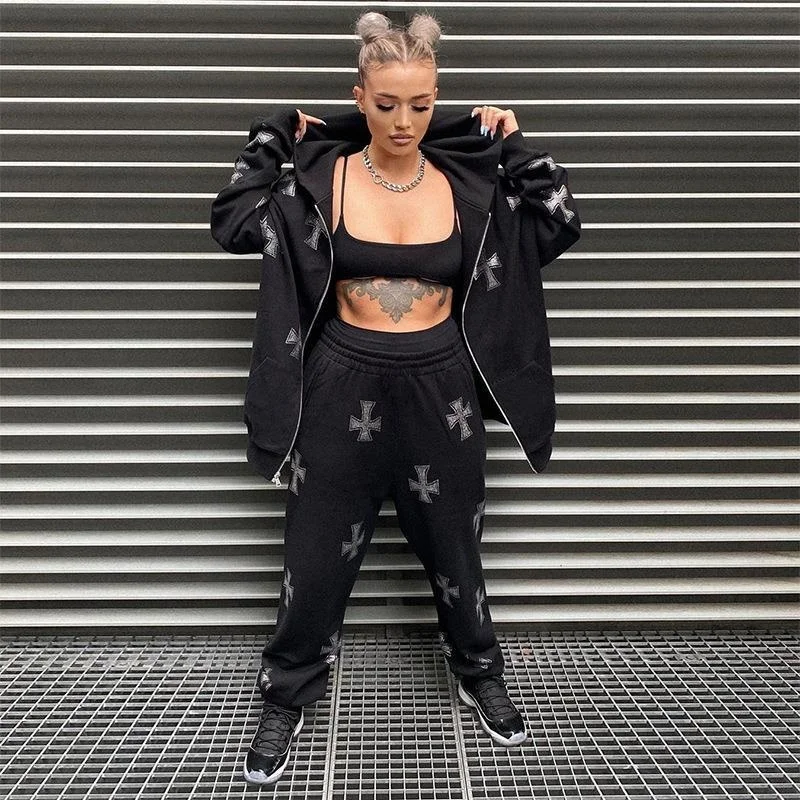 Y2k Стразы готический костюм из 2 предметов хип-хоп толстовка с дли...