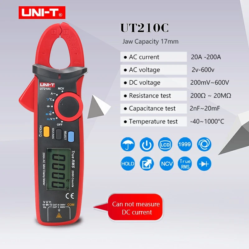 Мини-хомуты серии UT210 предназначены для хорошей работы в ограниченном пространстве. Это основные инструменты для технического обслуживания механического и электрического оборудования, установки бытовой техники и электрика. Имеет функцию бесконтактного индукционного измерения напряжения переменного тока (NCV), функцию измерения диода, которая может измерять падение напряжения до 3 в, высокоточная Функция измерения частоты с минимальным разрешением 0,001 Гц и высоким уровнем безопасности CAT II 300V / CAT II 600V.