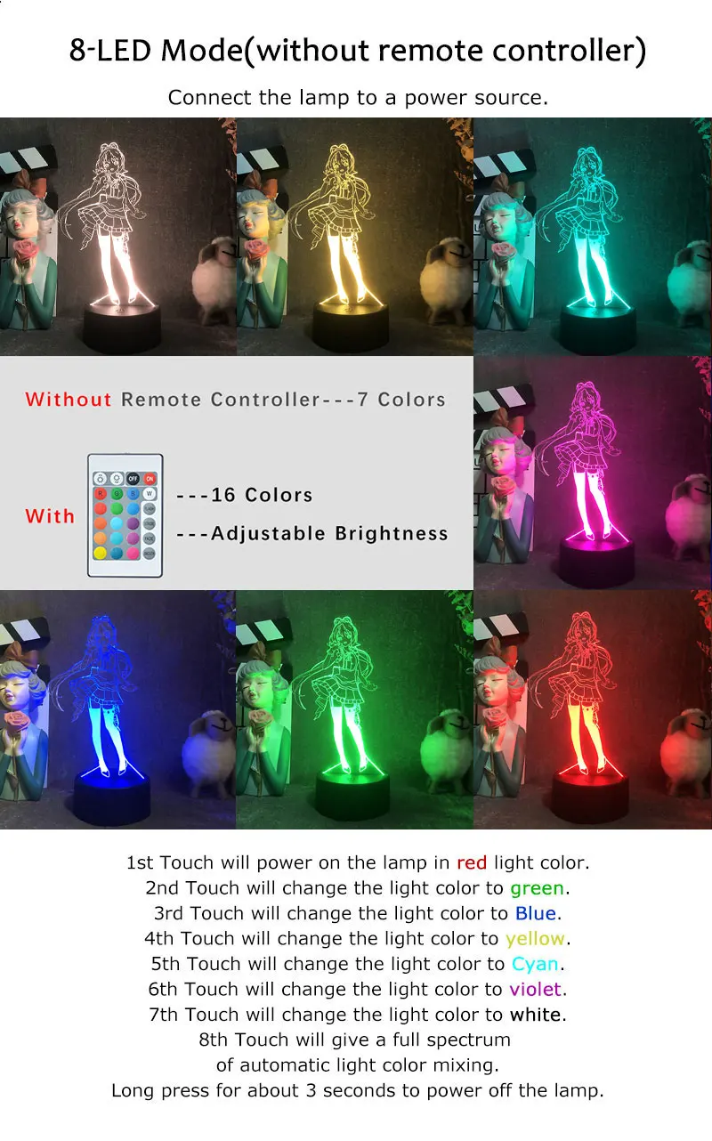 Артикул Тип: 3D светодиодный ночной СветильникОсновной Материал: АБС-пластикСветильник Материал направляющей пластины: акрилПроцесс: лазерная гравировкаРежим питания: USB/батарея (батарея не входит в комплект)Светильник источник света: светодиодныйСветильник: 7 цветов или 16 цветовСветильник: 3D стереоскопический рисунок (как показано на фотографии)Режим переключения: сенсорный выключатель/сенсорный выключатель + пульт дистанционного управленияНапряжение продукта: 5 ВМощность продукта: 3 Вт