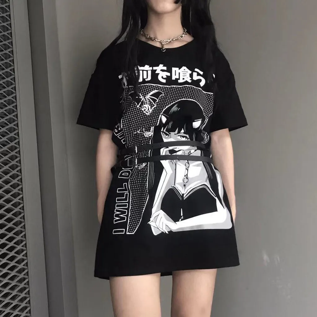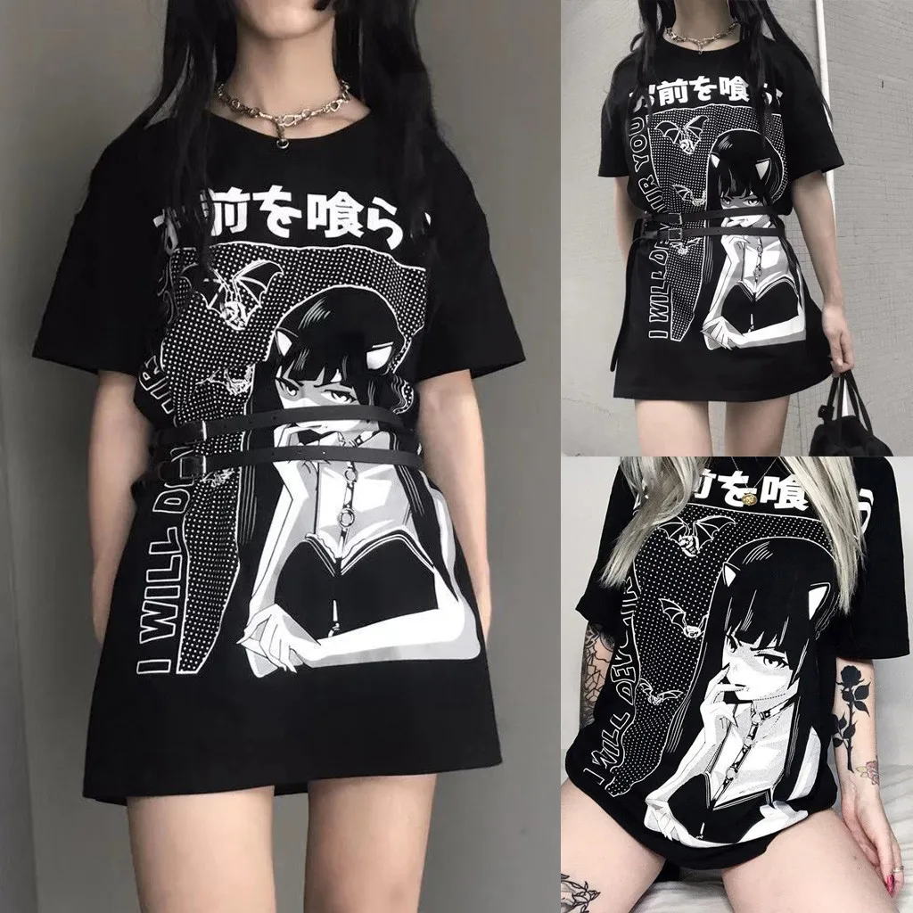 Женская футболка с круглым вырезом в готическом стиле, летняя свободная Длинная блузка с коротким рукавом, blusas mujer de moda 2021