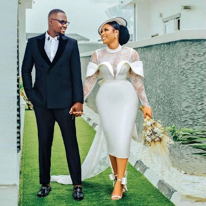 Женское свадебное платье до середины икры It's yiiya, белое платье в африканском стиле с длинным рукавом, кружевным топом и шлейфом на лето 2019
