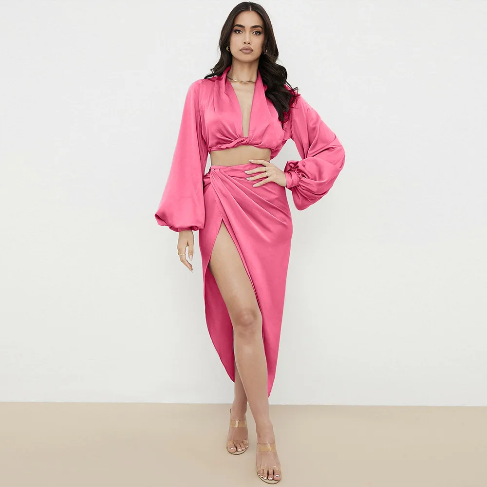 Женские черные подходящие комплекты Шелковый Атласный Драпированный укороченный Топ с длинным рукавом и юбка сексуальные женские комплекты из двух предметов модная одежда