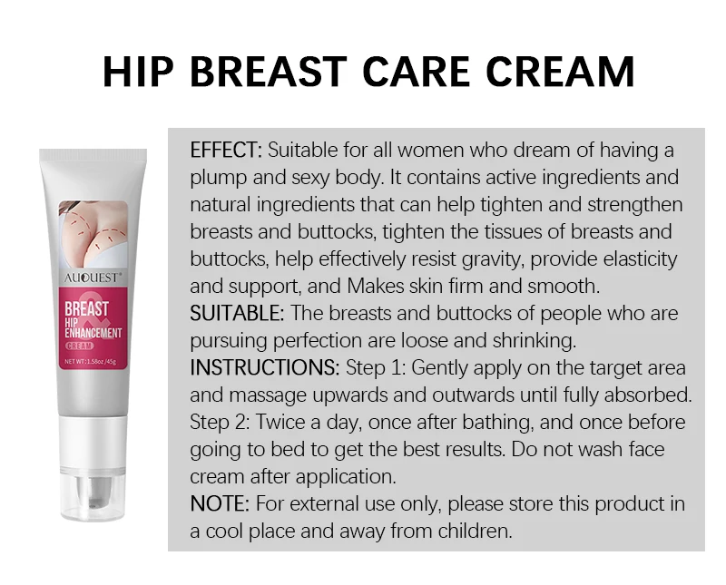 Название продукта: крем для груди (без коробки)Содержание нетто: 45 гЭффект: подходит для всех женщин, которые мечтают иметь плотное и сексуальное тело. Содержит активные ингредиенты и натуральные ингредиенты, которые могут помочь затянуть и укрепить грудь и ягодицы, затянуть ткани груди и ягодиц, помочь эффективно противостоять гравитации, обеспечить эластичность и поддержку, И делает кожу твердой и гладкой.Подходит: грудь и ягодицы людей, которые добиваются совершенства, свободны и сжимаются.Инструкции: Шаг 1: аккуратно нанесите на целевую область и массируйте вверх и наружу до полного впитывания. Шаг 2: два раза в день, один раз после купания, и один раз перед сном, чтобы получить лучшие результаты. Не мойте крем для лица после нанесения.Примечание: только для внешнего использования, пожалуйста, храните этот товар в прохладном месте и вдали от детей.