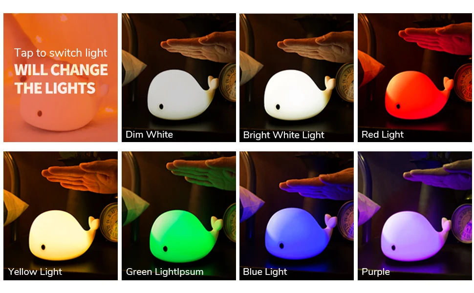 Ночные светильники с подсветкой "Кит" для детей, 7 светодиодных цветов, ночник с зарядкой от USB, декор для детской комнаты, внутреннее освещение