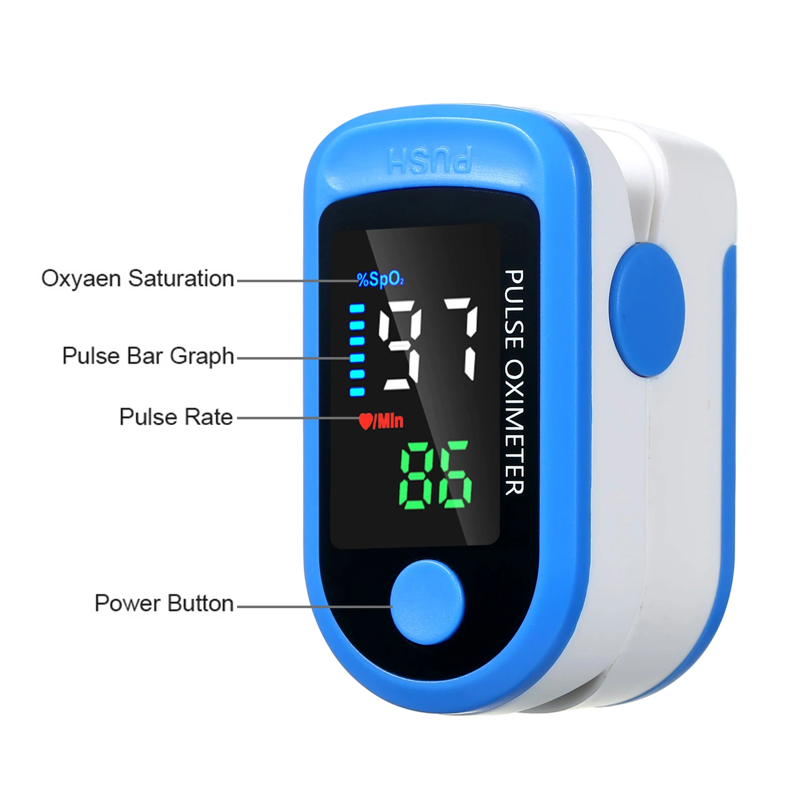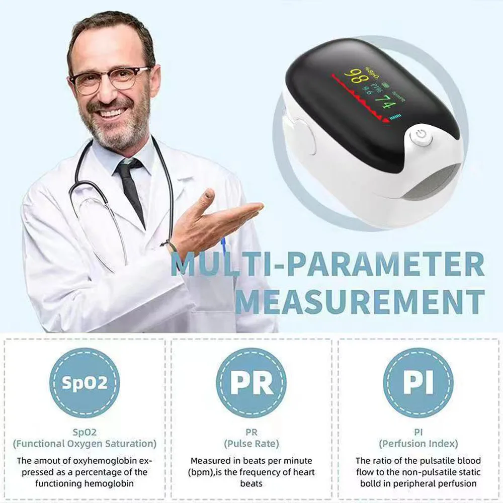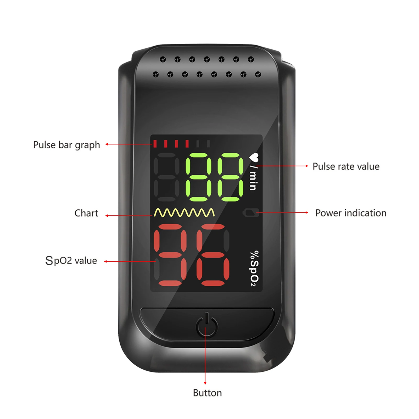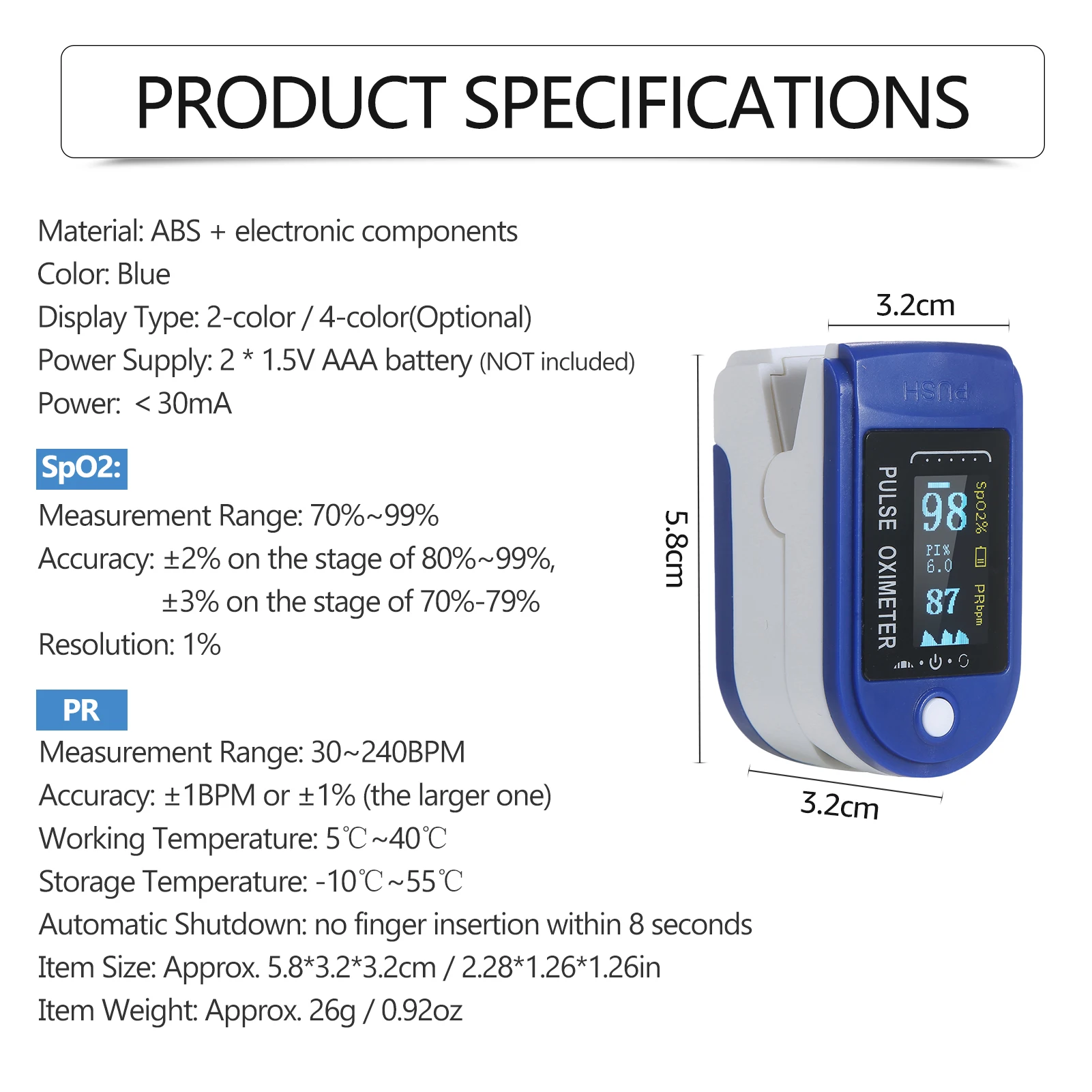 Оксиметр может использоваться для измерения насыщения кислорода, пульса через палец. Продукт подходит для семьи, личной гигиены в спорте и т. Д.