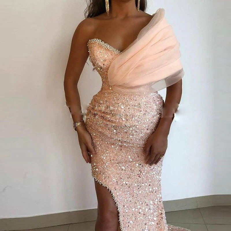 Вечернее платье-русалка, с высоким вырезом, на одно плечо, с бисером, жемчугом, с блестками, для выпускного вечера, арабские одежды