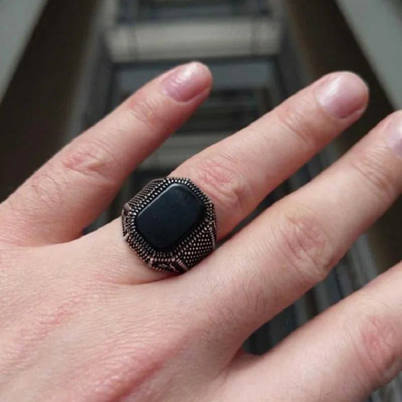 Модные украшения из Турции, натуральный черный квадрат, агат, мужское кольцо с узором, кольцо из нержавеющей стали, инкрустированное вечерние, панк, байкерские кольца