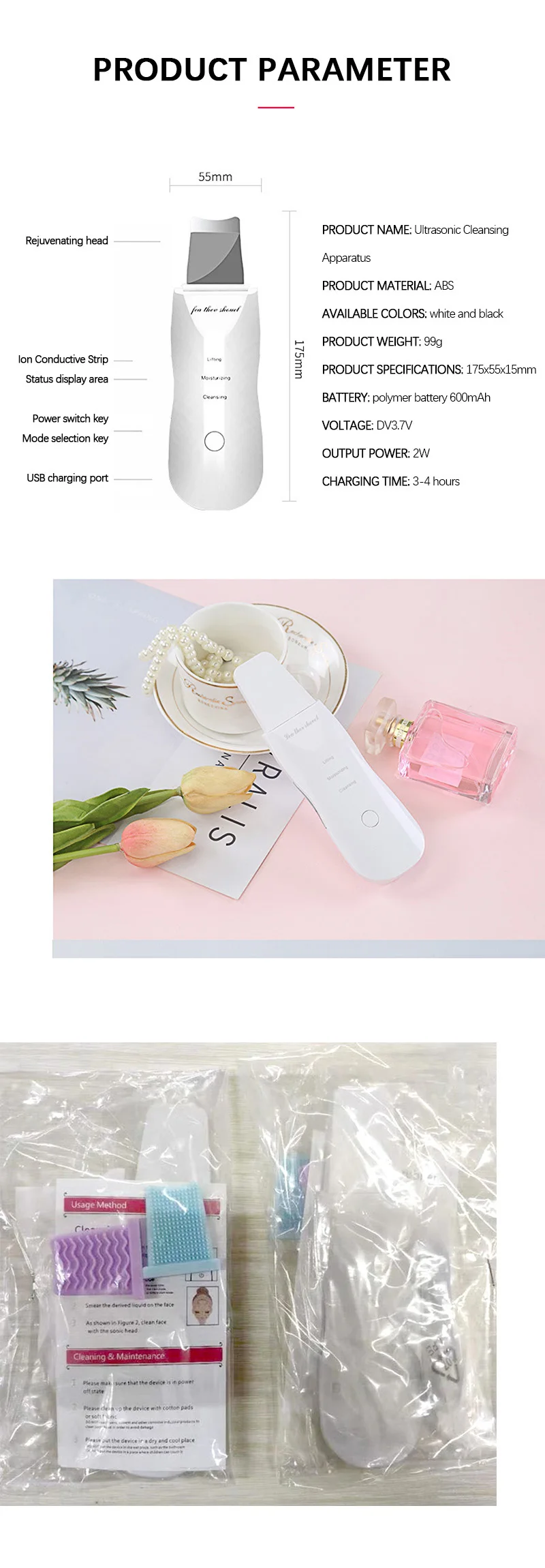 Название продукта: ультразвуковой очищающий аппаратАксессуары: две массажные силиконовые головки, одна инструкция, один usb-кабель для зарядкиМатериал изделия: АБС-пластикВес изделия: 99 гХарактеристики продукта: 175x55x15ммАккумулятор: полимерный аккумулятор 600 мАчНапряжение: DV3.7VВыходная мощность: 2 ВтВремя зарядки: 3-4 часа