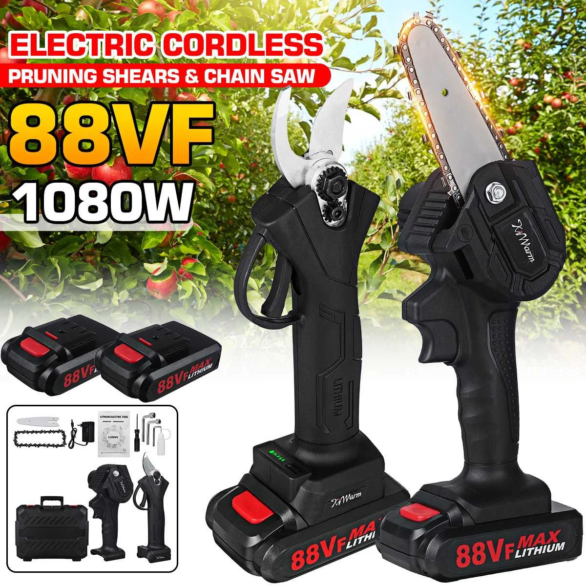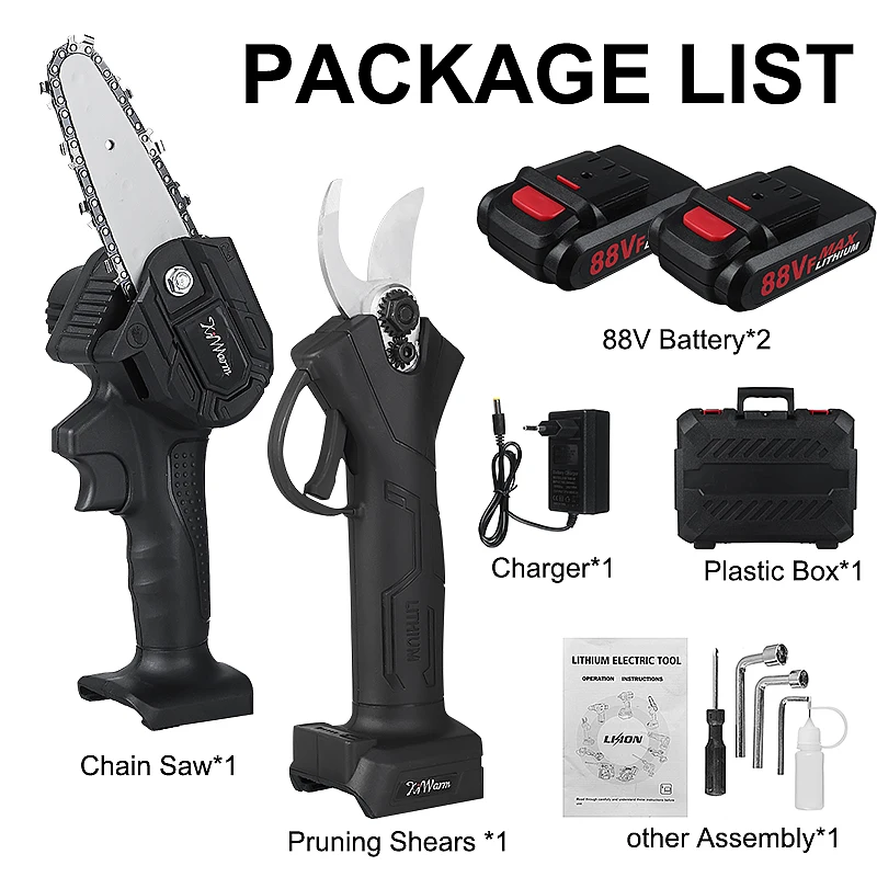 Упаковочный лист:1 Электрическая цепная пила1 секаторАккумулятор 1/2 x1 зарядное устройство (вилка для ЕС/США)3 x гаечный ключ1 отвертка1 x бутылка для смазочного масла2 x Руководство пользователя1 х пластиковая коробкаО: 88VF электрическая Беспроводная цепная пилаСпецификация:-Материал: металлическая стальная цепь-Напряжение: 88VF-Цвет: черный-Мощность аккумулятора: 1080 Вт-Длина направляющей пластины: 4 дюймаОсобенности:-Практичный, быстрая скорость, низкое энергопотребление.-Двигатель из чистой меди, высокая мощность, быстрая резка, повышение эффективности.-Высококачественный переключатель, быстрая и медленная регулировка, плавное изменение скорости.-Высококачественная направляющая пластина, глубокая закалка, более износостойкая, гладкая резка.-Перезаряжаемая Электрическая цепная пила светильник и портативная, долгий срок службы батареи, без повреждения коры.Светильник корпус светильник и удобный светильник дизайн, долгое время держит и не устает руки.-Интеллектуальный плата управления цепью, защита от перегрузки, для удовлетворения различных потребностей в строительстве.-Управление одной рукой: небольшой размер, можно удерживать одной рукой.B:88VF электрические беспроводные секаторыСпецификация:-Напряжение: 88VF-Цвет: черный-Основные Материалы: ПВХ + металл-Пиковая мощность: 500 Вт-Макс. Резка: 30 ммОсобенности:-Эргономичная и удобная ручка.-Низкий уровень шума, хорошая устойчивость к усталости.-Прочное Лезвие из вольфрамовой стали.-Перезаряжаемая литиевая батарея большой емкости для беспроводного использования.-Качество обрезки может соответствовать требованиям садоводства.-Беспроводные перезаряжаемые секаторы для резки и обрезки веток в фруктовых садах, виноградниках.-Гибкий в использовании, легко поворачивается, безопасный и надежный, простой в обслуживании, удобный для замены аккумулятора и эксплуатации.Примечание:1. Возможны отклонения в 1-3 см из-за ручного измерения. Перед размещением заказа, пожалуйста, внимательно ознакомитесь со всеми условиями.2. Цвета на дисплеях могут отличаться, надеемся на понимание.