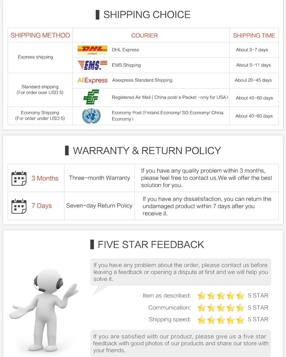 2. Заказы обрабатываются своевременно после подтверждения оплаты.3. Мы отправляем только по подтвержденным адресам заказа. Ваш адрес заказа должен совпадать с вашим адресом доставки.4. Представленные изображения не являются фактическим товаром и предназначены только для справки.5. Время доставки определяется перевозчиком и не включает выходные и праздничные дни. Сроки доставки могут меняться, особенно во время курортного сезона.6. Если вы не получили посылку в течение 30 дней с момента оплаты, пожалуйста, свяжитесь с нами. Мы отследим отправку и свяжемся с вами как можно скорее. Наша цель – удовлетворение клиентов!7. Из-за наличия на складе и разницы во времени, мы выберем доставку Вашего товара с нашего первого доступного склада для быстрой доставки.
