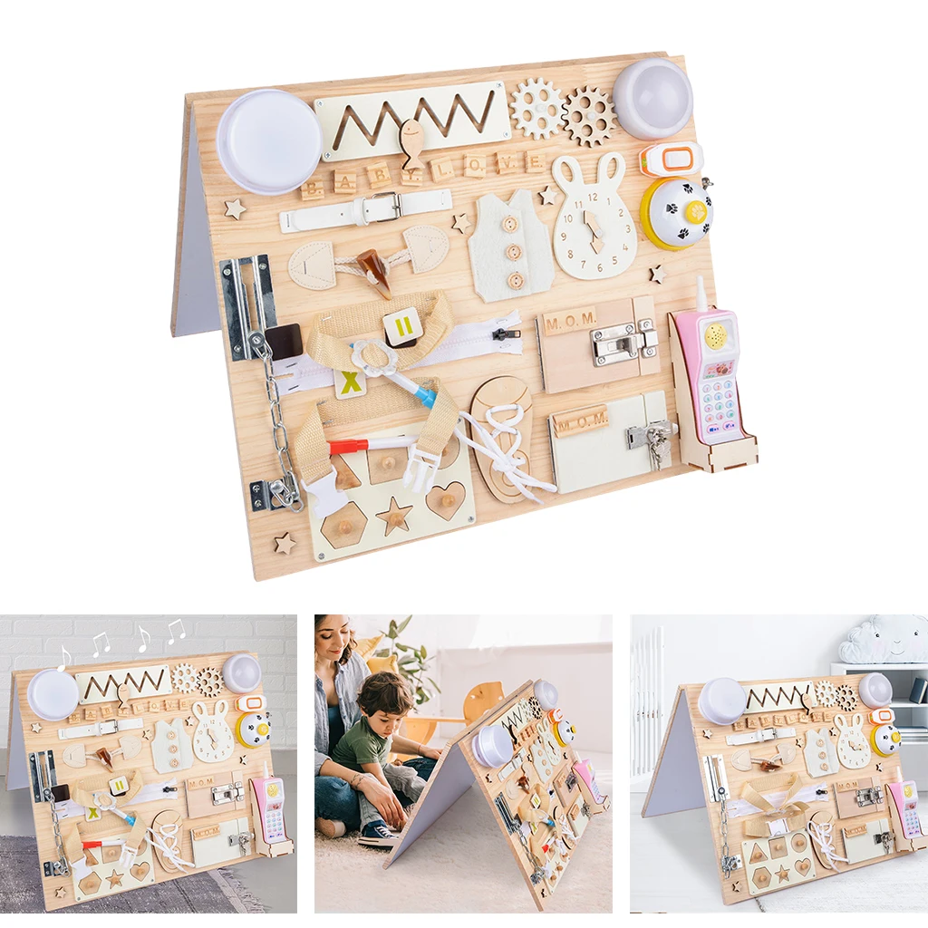 Занятые настольные игрушки позволяют детям привязывать и застегивать свой путь к самостоятельному одеванию жизненных навыков.Специально разработан для детей 1-2 лет, которые учатся застегивать молнию, пряжку, шнурки, моторику, музыку и форму.Помогает детям использовать руки для точных движений, помогает детям наслаждаться использованием своих чувств. Тренирует пальцы вашего ребенка.Доска из натурального дерева гибкая, без твердых углов. Безопасно играть.Маленькая игрушка отлично подходит для путешествий, например, в самолете или на машине. Отличный подарок для детей 1-2 лет.