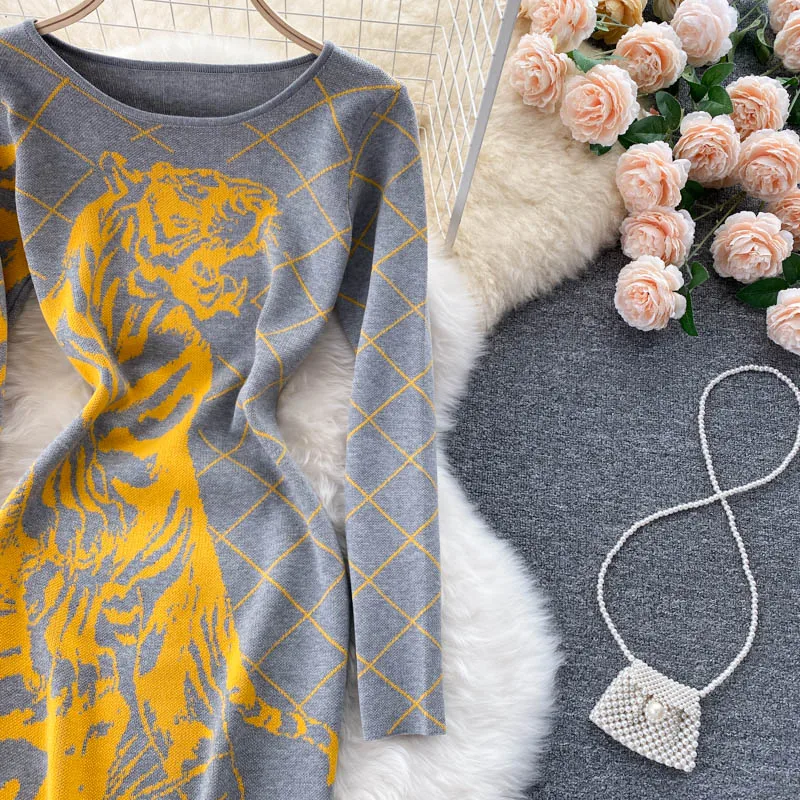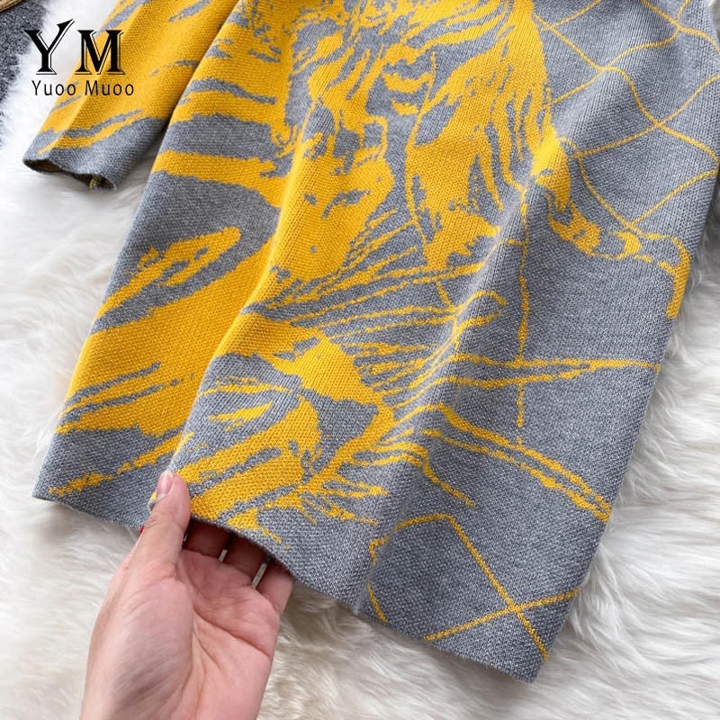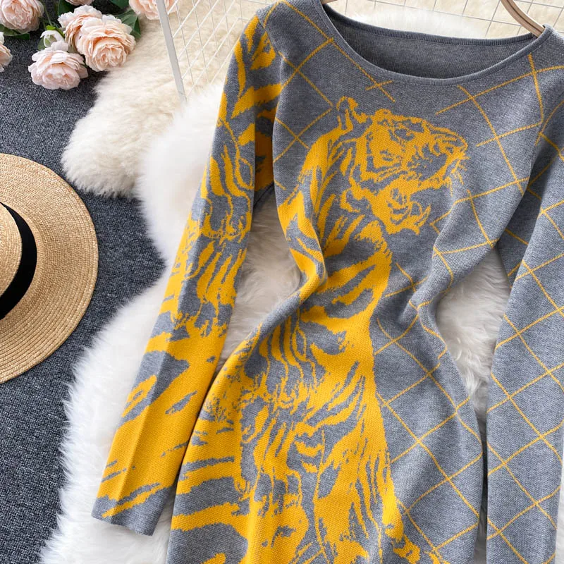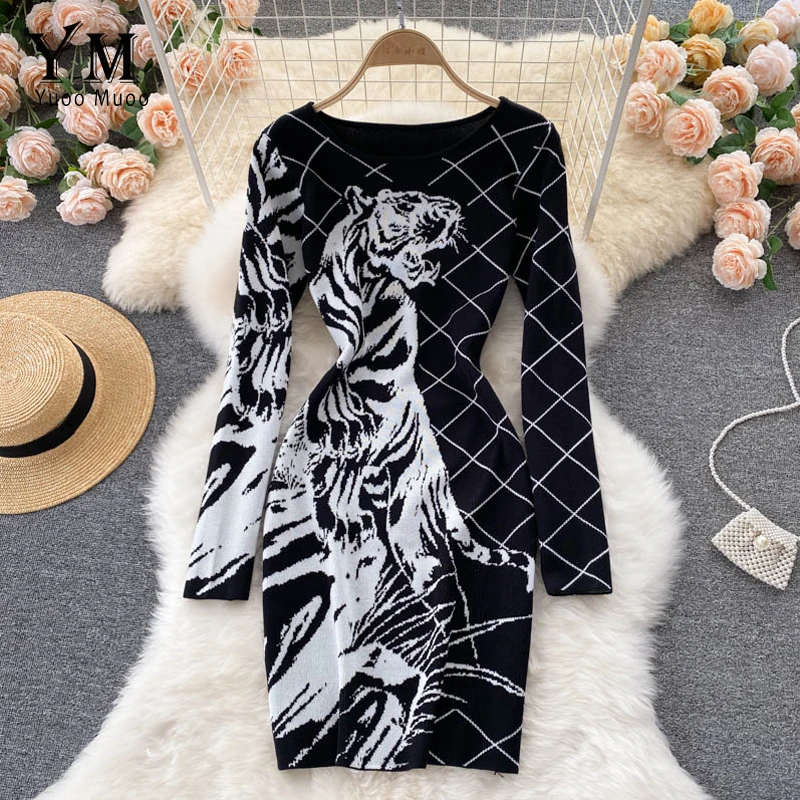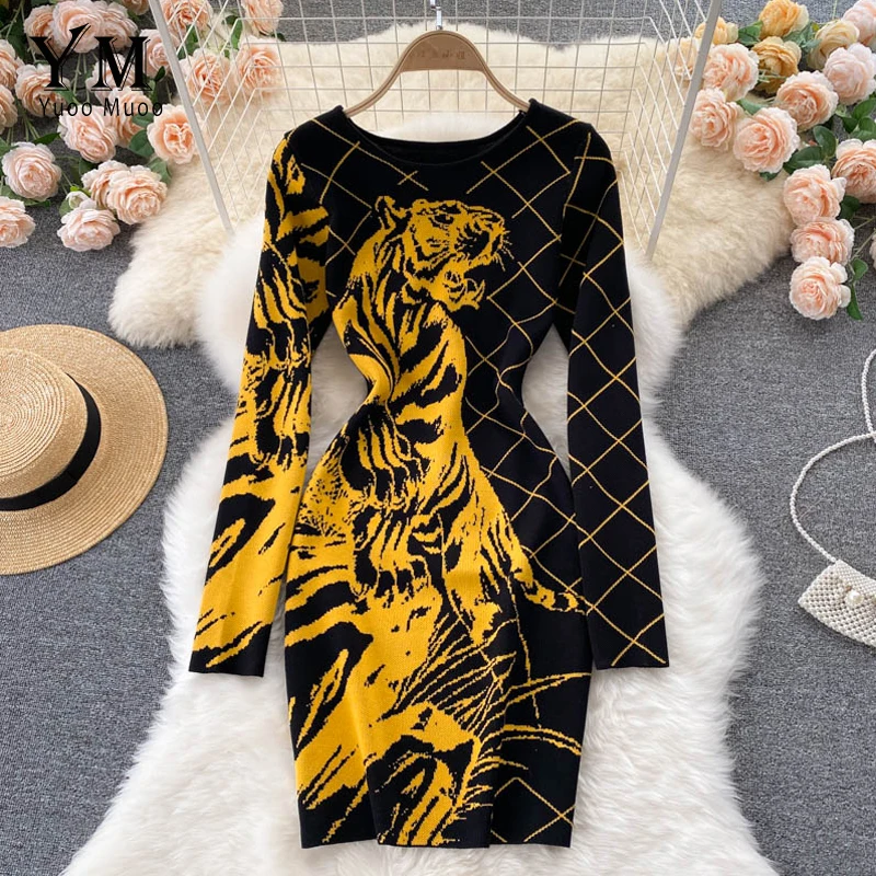 Осенне-зимнее женское вязаное платье-свитер YuooMuoo, новинка 2021, фирменное платье с длинным рукавом и принтом Тигра для офиса, женское платье для работы, платья