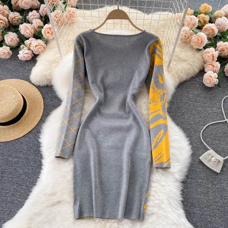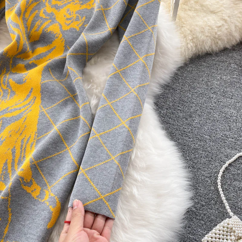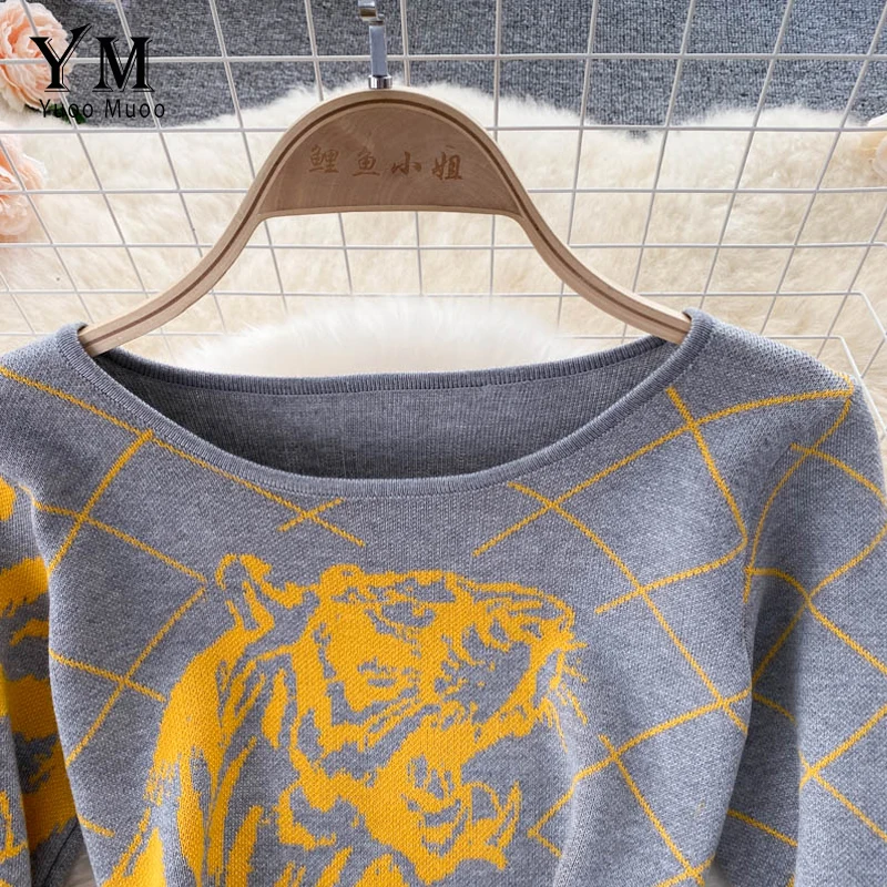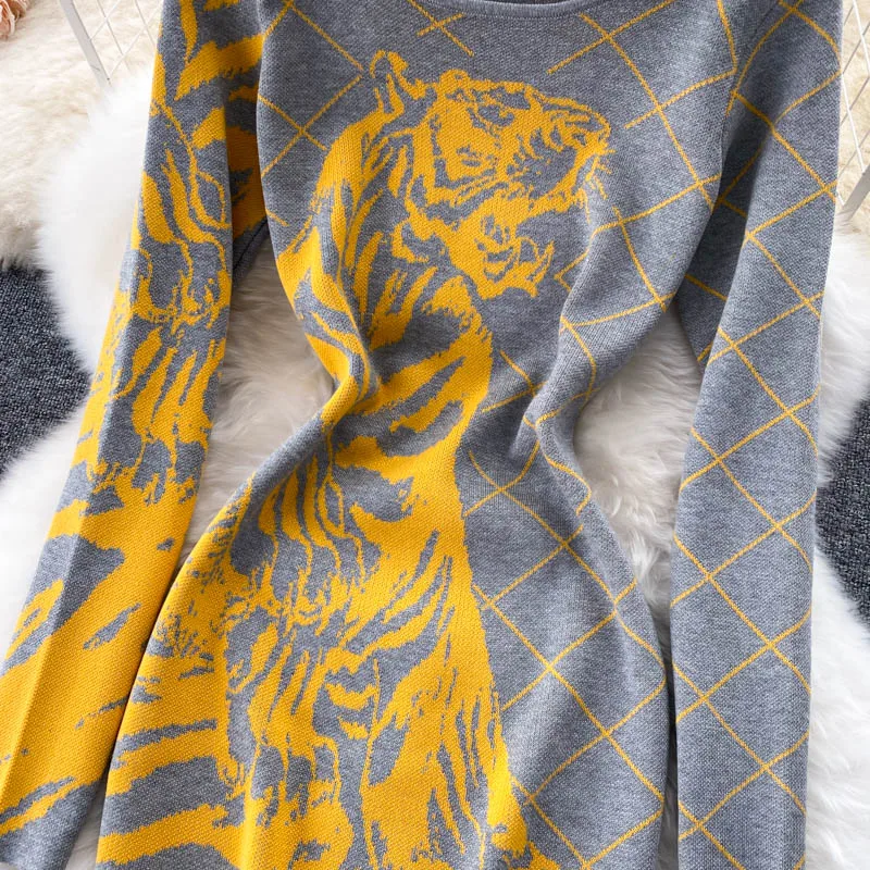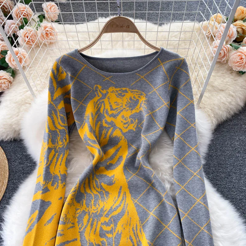 Осенне-зимнее женское вязаное платье-свитер YuooMuoo, новинка 2021, фирменное платье с длинным рукавом и принтом Тигра для офиса, женское платье для работы, платья