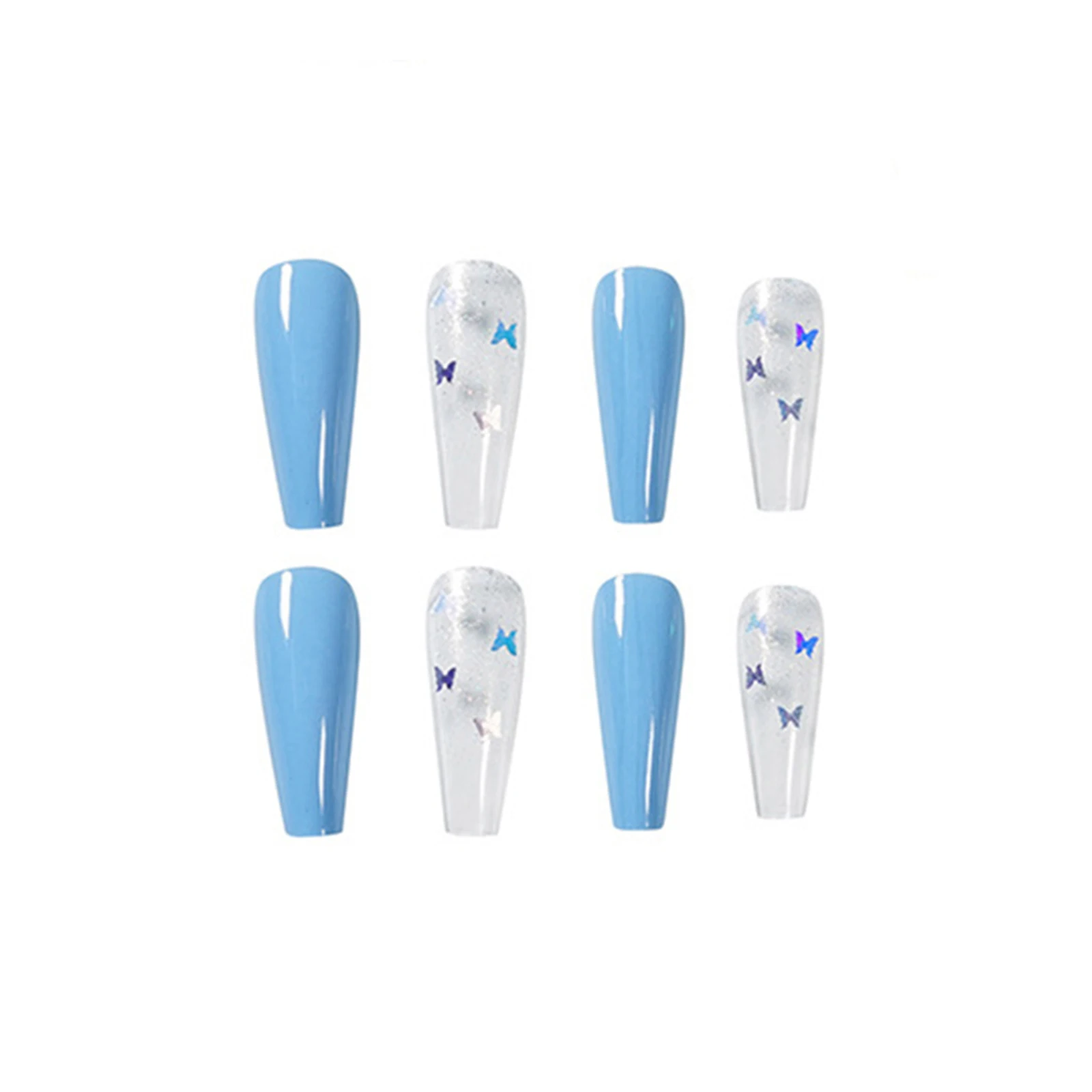 Накладные ногти, Длинные акриловые, с бабочкой, голубого цвета, 24 шт.