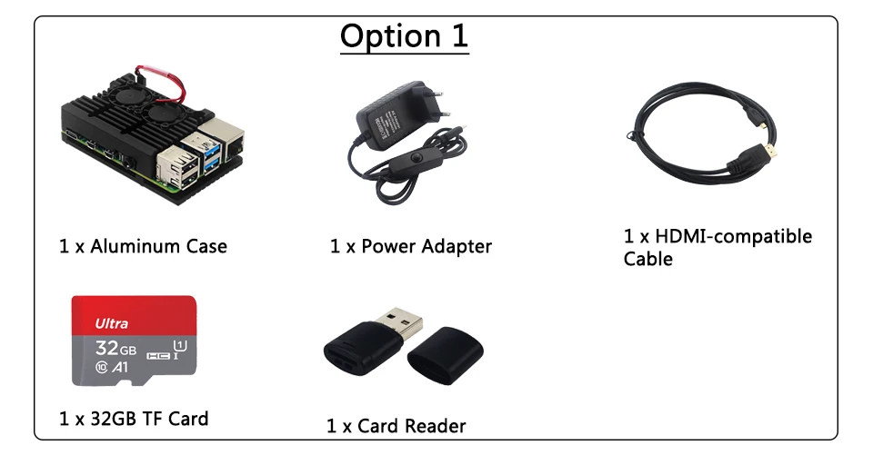 1 х Алюминиевый Чехол1 х адаптер питания1 х HDMI-совместимый кабель1x64 ГБ TF картаКард-Рейдер-1 шт.(Не включает Raspberry Pi)