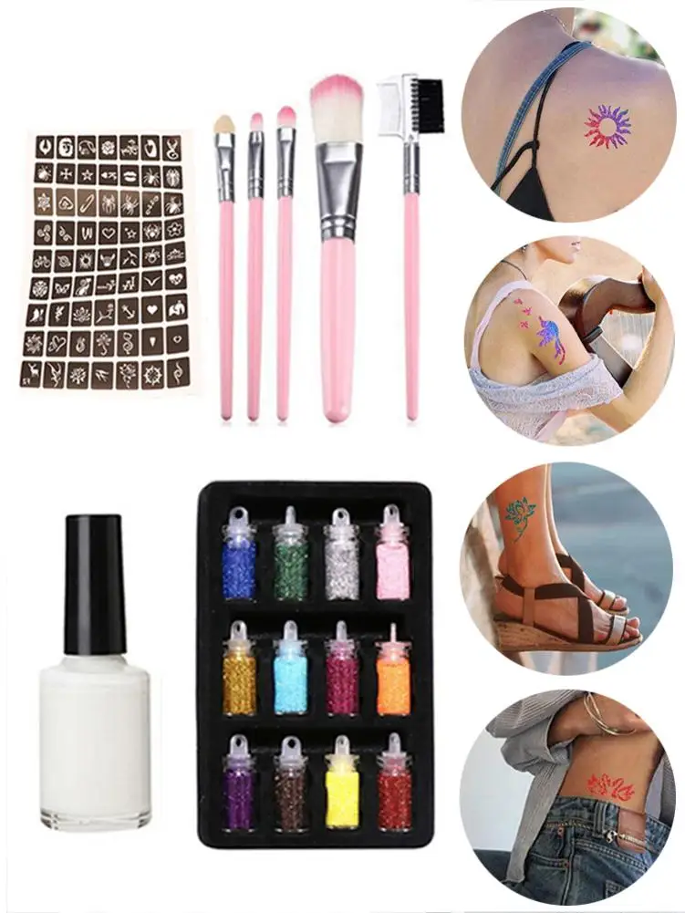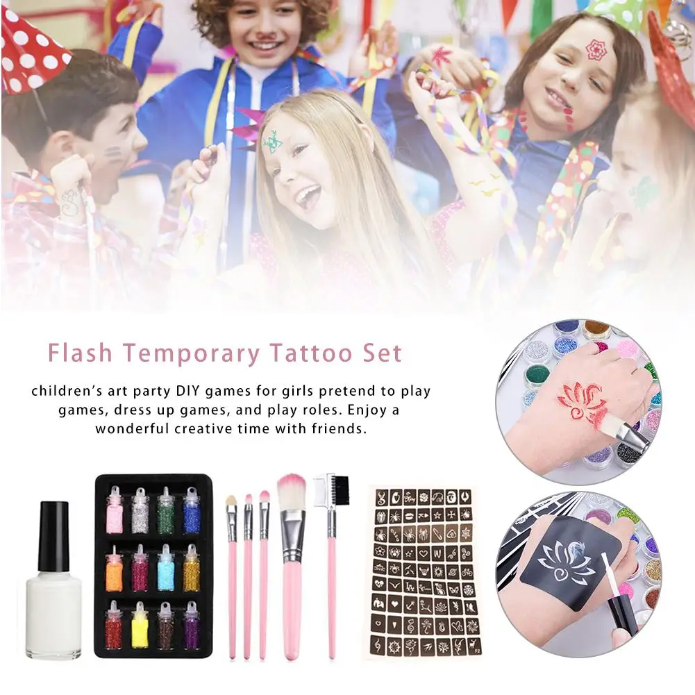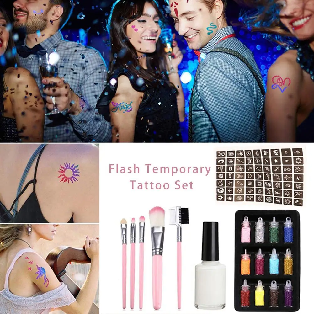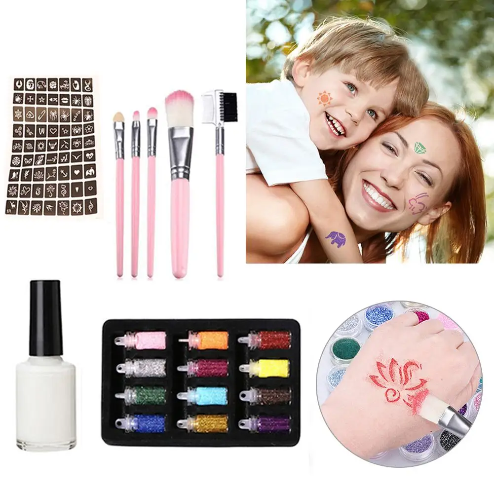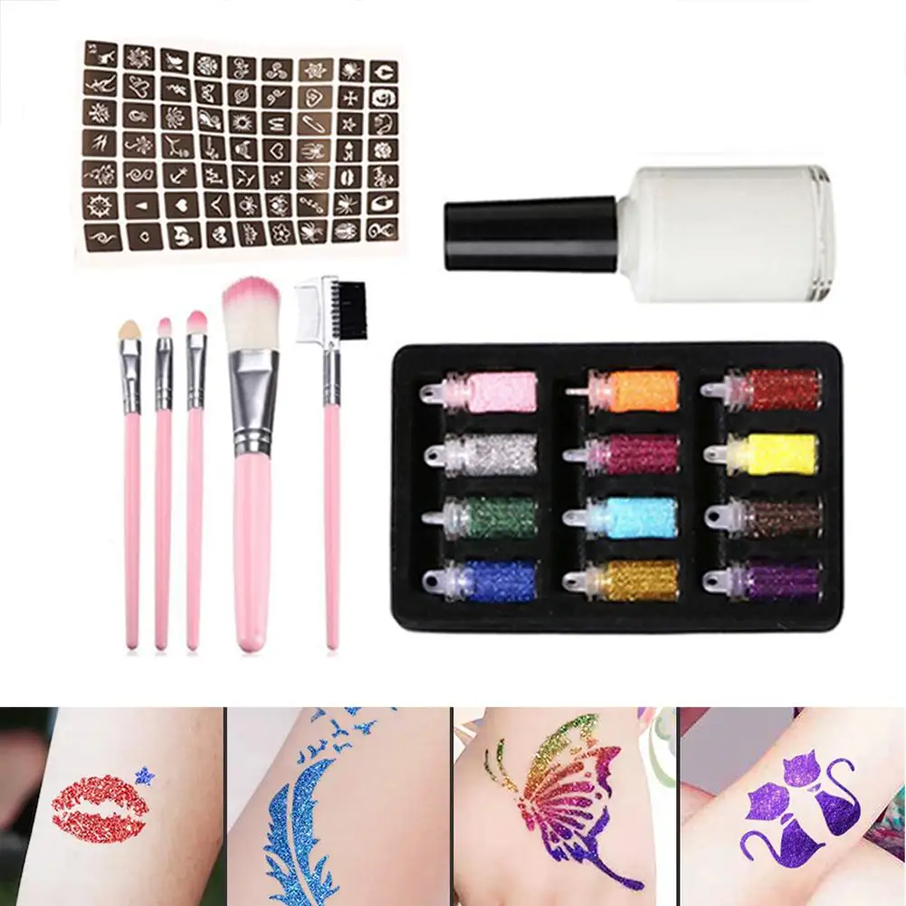 Набор для временных татуировок, с 12 блестками, полые, 1 шаблон для татуировок, 1 клей, 5 кистей для детей, подростков, взрослых
