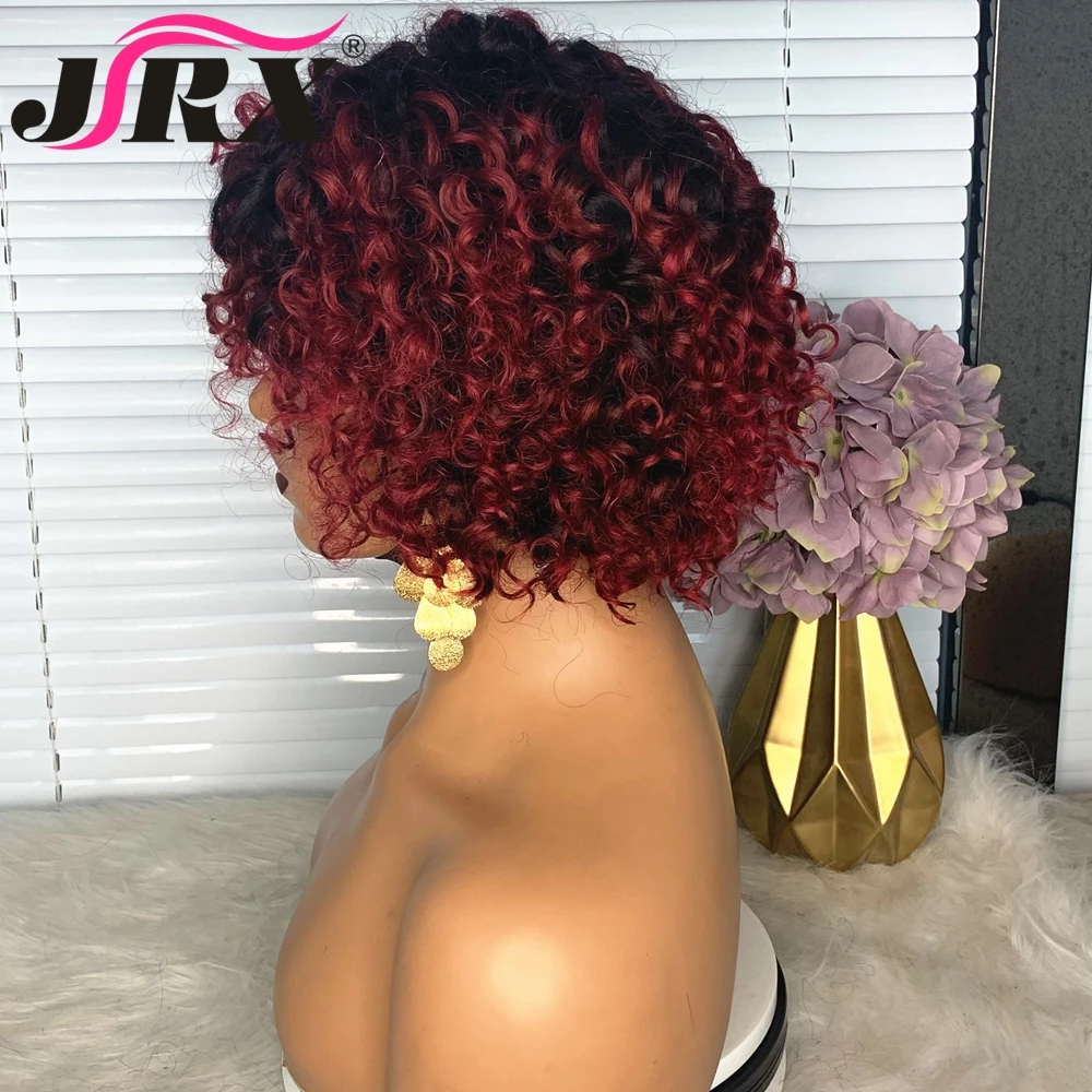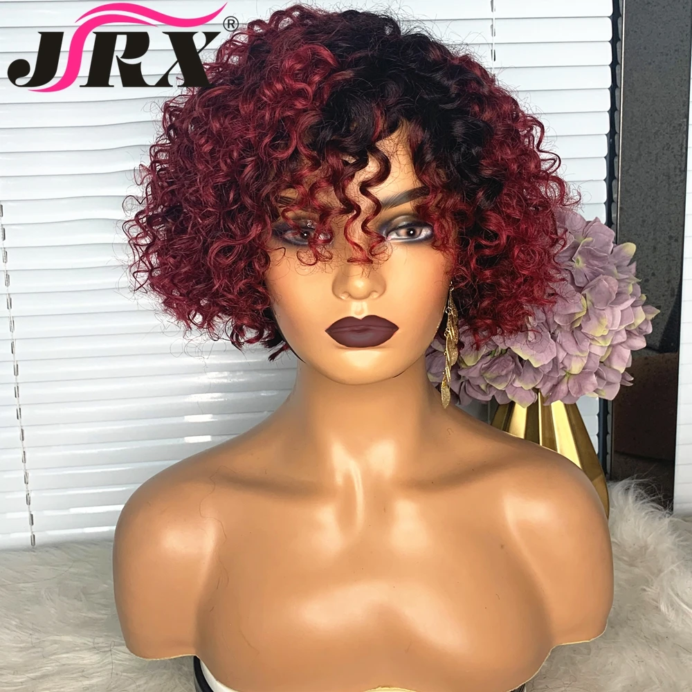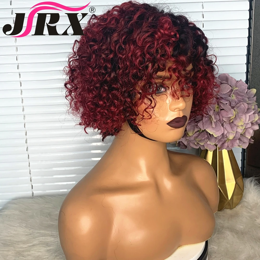 Короткие вьющиеся бордовые парики из человеческих волос с челкой 1B99J, цветные парики с Омбре, полноразмерные парики машинной работы, плотность 180, глубокие вьющиеся волосы Remy
