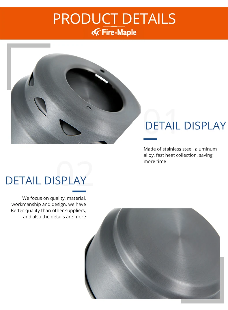 ЭтоНабор для приготовления пищи содержит два горшка, меньший горшок можно использовать в качестве покрытияИли миска, оба изготовлены из анодированного алюминия, которые легкие,Тепло и устойчивость к царапинам, прочный и легко чистится. Он может хранитьГазовая канистра 220 г и плита, подходит для 2 или 3 человек в деньПоходов. Складная ручка покрыта силиконовым покрытием для предотвращенияТепло. Теплообменник на дне может повысить эффективность нагреваНа 30%, повышение эффективности использования топлива и экономия топлива.
