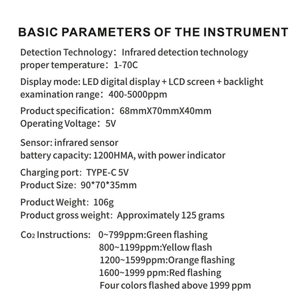 Особенности:Большой ЖК-экран, различные цвета шрифта отображают различное качество воздуха, зеленый 400-799ppm, желтый 800-1199ppm, оранжевый 1200-1599ppm, красный 1600-1999ppm, 2000ppm выше четырех цветов мигают одновременно.Изделие компактное по размеру и легко носить с собой. Вентиляционные отверстия в задней части не только ускоряют конвекцию между воздухом и машиной, чтобы достичь эффективного обнаружения, но также обеспечивает эффект тонкого рассеивания тепла.Продукт не нуждается в калибровке, запуск может быть протестирован, Точное обнаружение углекислого газа, используется в парниковом сельскохозяйственном производстве, производственном складе, лаборатории, семье и т. Д.Широко используется и практичен, используется для предотвращения и контроля распространения вирусов для обнаружения концентрации CO2 в популяции, чтобы контролировать количество людей и избежать риска перекрестной инфекции.Аккумулятор большой емкости 1200 мАч для длительного рабочего времени, интерфейс зарядки Type-C, легкая зарядка.Характеристики:Цвет: черный, белый (по желанию)Диапазон измерения CO2: 400-5000ppmДиапазон измерения температуры: 0-50 ℃Диапазон измерения влажности: 0%-99% RHБатарея: 3,7 V, 1200mAhРазмер изделия: 90*70*35 мм/3,5*2,8 * 1.4inВес товара: 117 г/4,1 унцииРазмер посылка: 140*125*41 мм/5,5*4,9*1,6 дюймовПосылка Вес: 173 г/6,1 унцииУпаковочный лист:1 * анализатор качества воздуха1 * USB кабель1 * Руководство пользователя