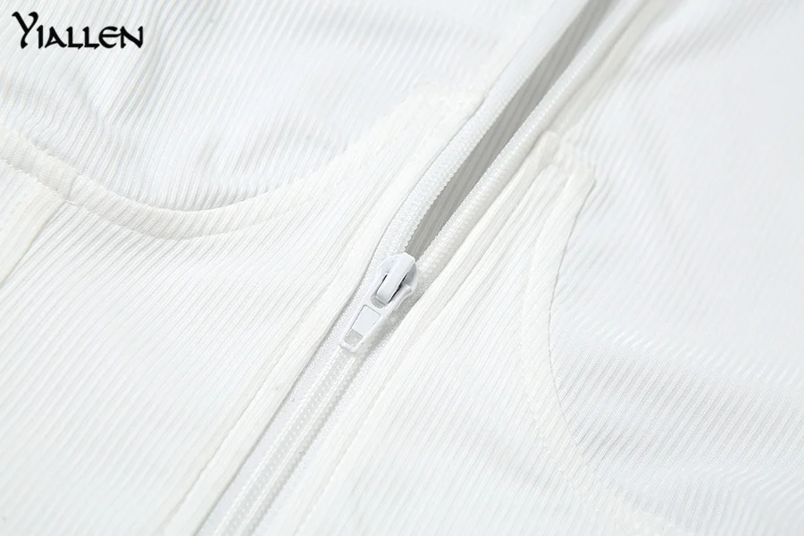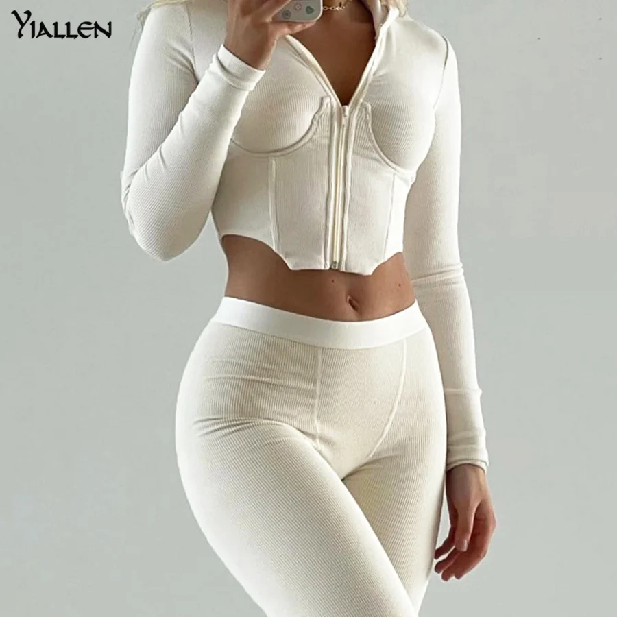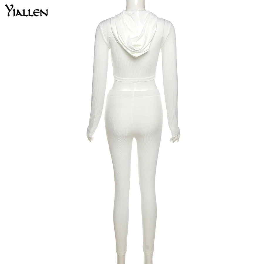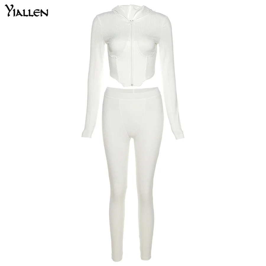 Yiallen Новый хипстерский трикотажный комплект из двух предметов женский топ на молнии с нагрудной застежкой и капюшоном + однотонные облегающие спортивные женские брюки Горячие