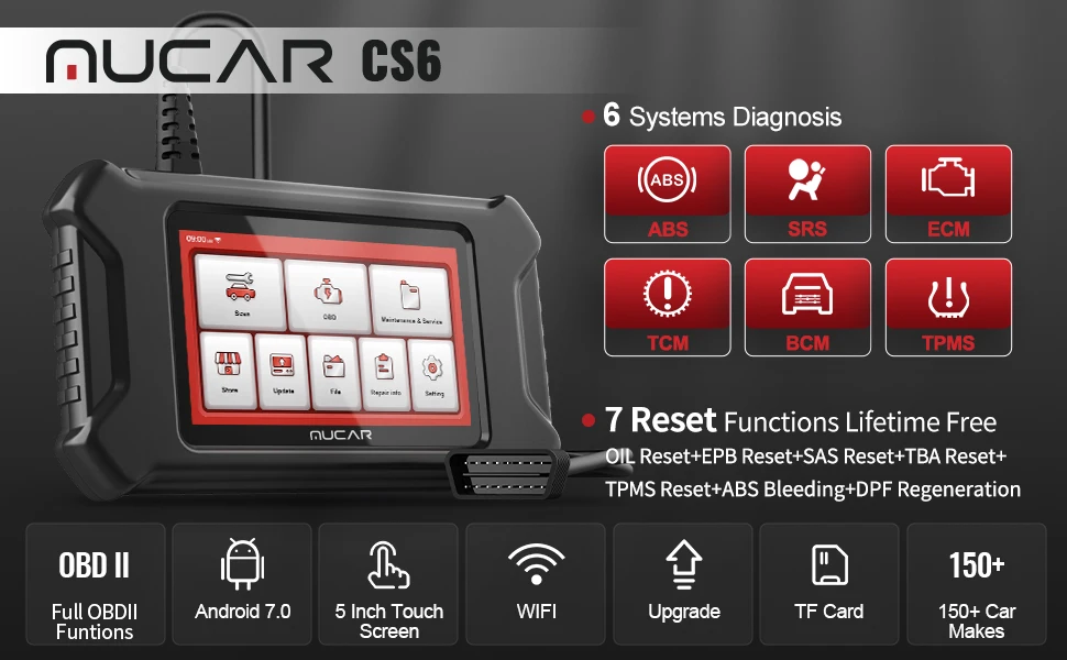 Вас беспокоит обновление модельного программного обеспечения и функций? Поддержка MUCAR CS6 6 систем (ABS/SRS/ECM/TCM/BCM/TPMS) и 7 сбросов (масло/EPB/SAS/TPMS/TBA/ABS/DPF) услуги на весь срок службы бесплатно.1. Поддержка MUCAR CS6 для диагностики ошибок системы ABS/SRS/ECM/TCM/BCM/TPMS и удаления ошибок.2.MUCAR CS6 поддерживает полную функцию obd 2, включая чтение/четкие коды, поток данных, готовность I/M, датчик O2, DTC поиск и многое другое ....3.MUCAR CS6 поддерживает сброс 7 (масло/EPB/SAS/TPMS/TBA/ABS/DPF) услуги на срок службы бесплатно.4. Вы можете сделать ярлыки экрана через ключ I/M с устройствами MUCAR CS6, легко и быстро5. Поддержка MUCAR CS6 для печати данных диагностического отчета, проверка ошибок6. Обновление программного обеспечения MUCAR CS6 свободный срок службы.