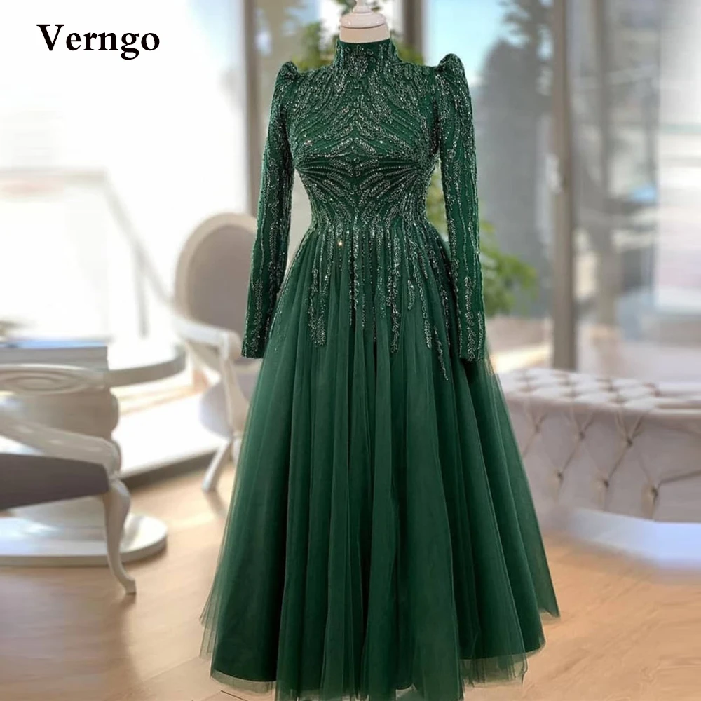 Verngo сдержанные зеленые тюлевые вечерние платья с высоким воротником с длинными рукавами бусинами длиной до щиколотки платья для выпускного вечера для Саудовской Аравии женское официальное платье