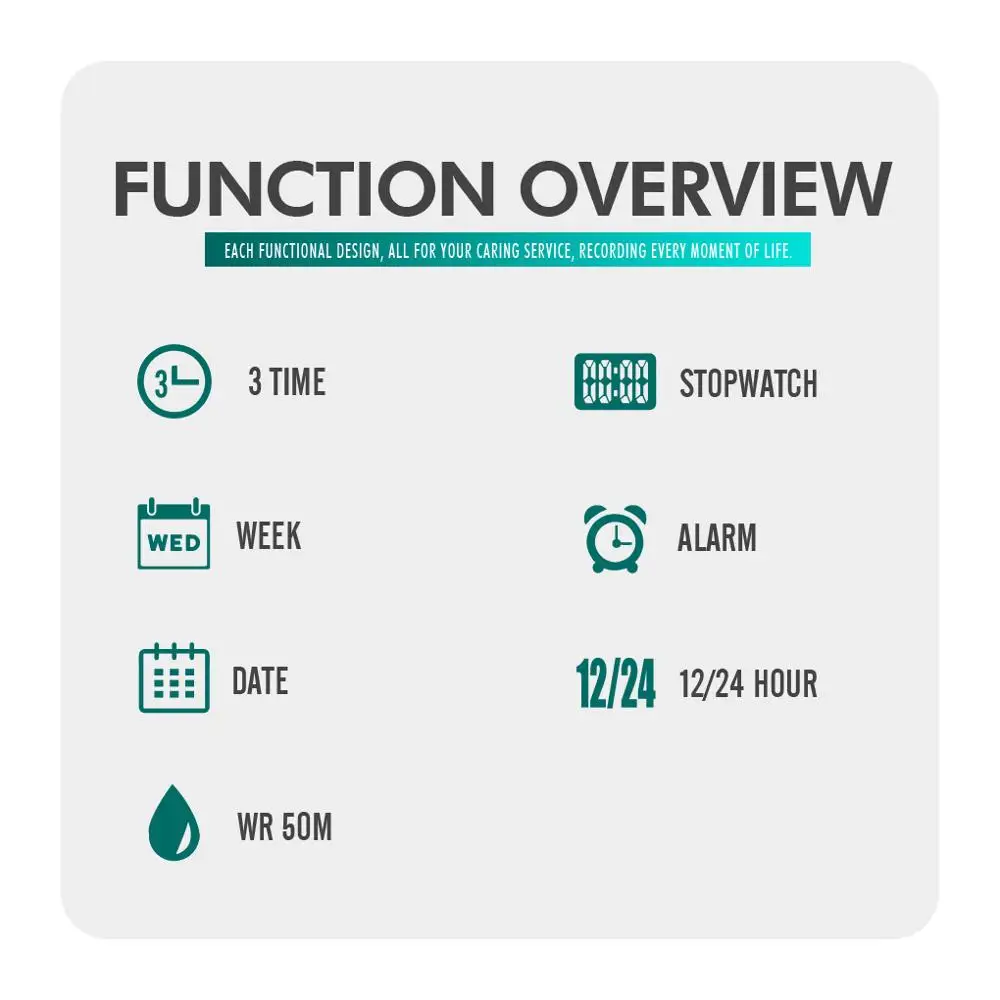 FeaturesStop Watch, Repeater,Luminous,Complete Calendar, Alarm,Week Display