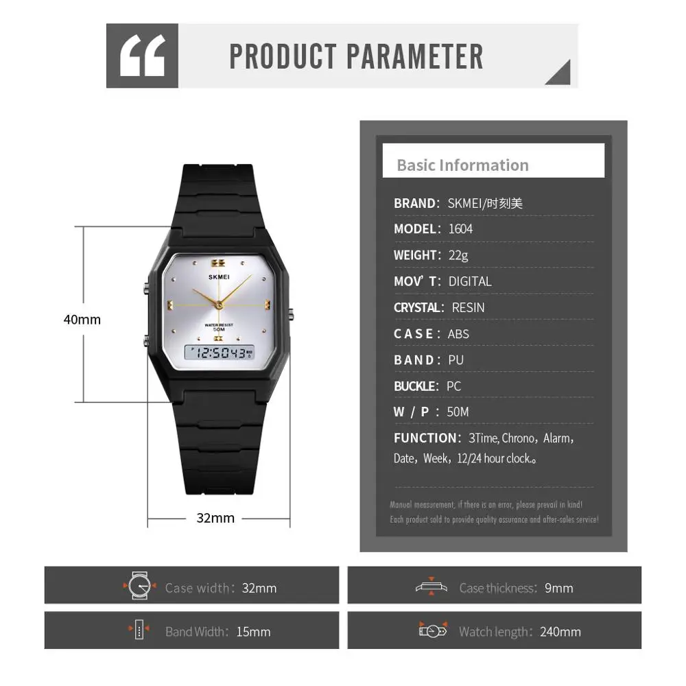 Бренд: SKMEI Пол: мужские часы Стиль: Модный и Повседневный стиль, спортивный Материал корпуса: искусственная кожа Материал ремешка: нержавеющая сталь PC стрелочный Диаметр: 32 мм/1,26 в случае Толщина: 9 мм/0,35 в диапазоне Ширина: около 15 мм/0,59 в диапазоне Длина: 240 мм/9,45 в функции: 3bar водонепроницаемые, светодиодный дисплей, время, светящиеся. (Глубина водонепроницаемости до 50 м (пожалуйста, не нажимайте кнопки под водой)