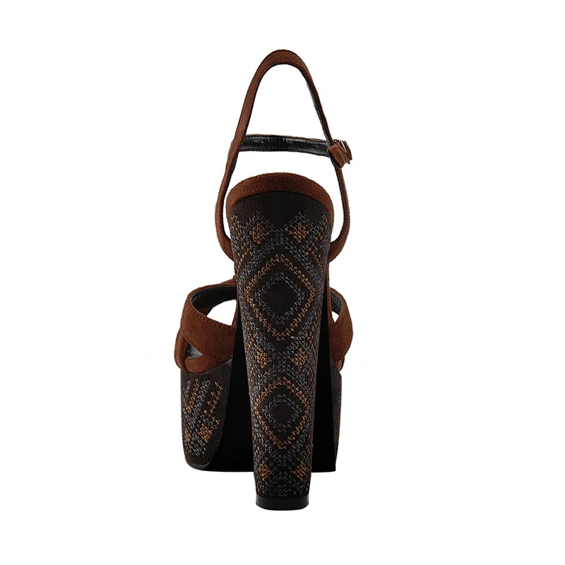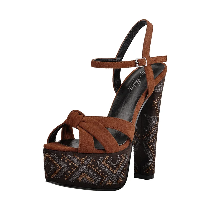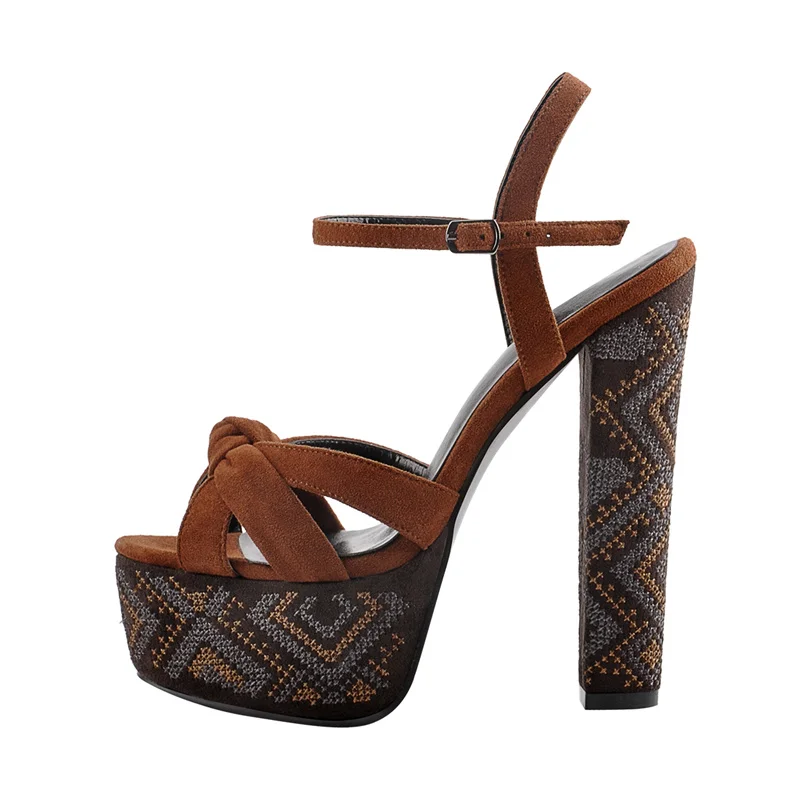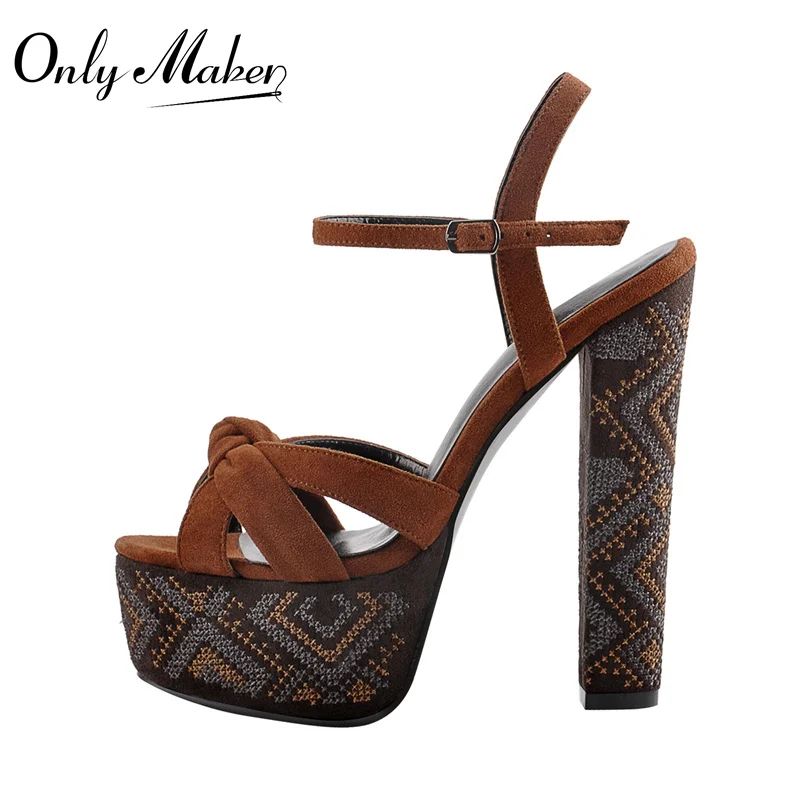 Женские босоножки на платформе Onlymaker, летние коричневые туфли из флока с завязкой на щиколотке, обувь на высоком массивном каблуке с вышивкой в этническом стиле