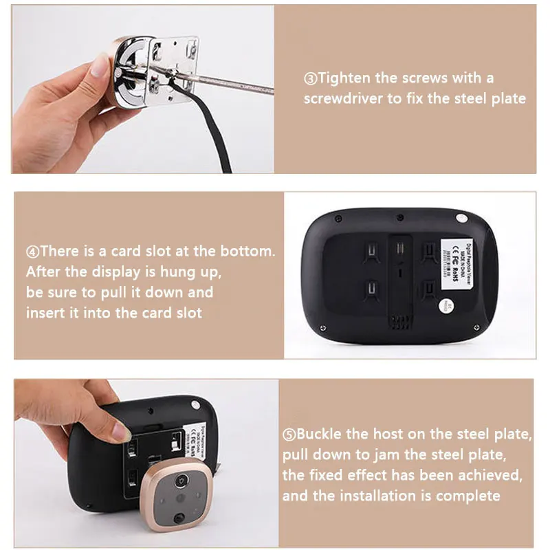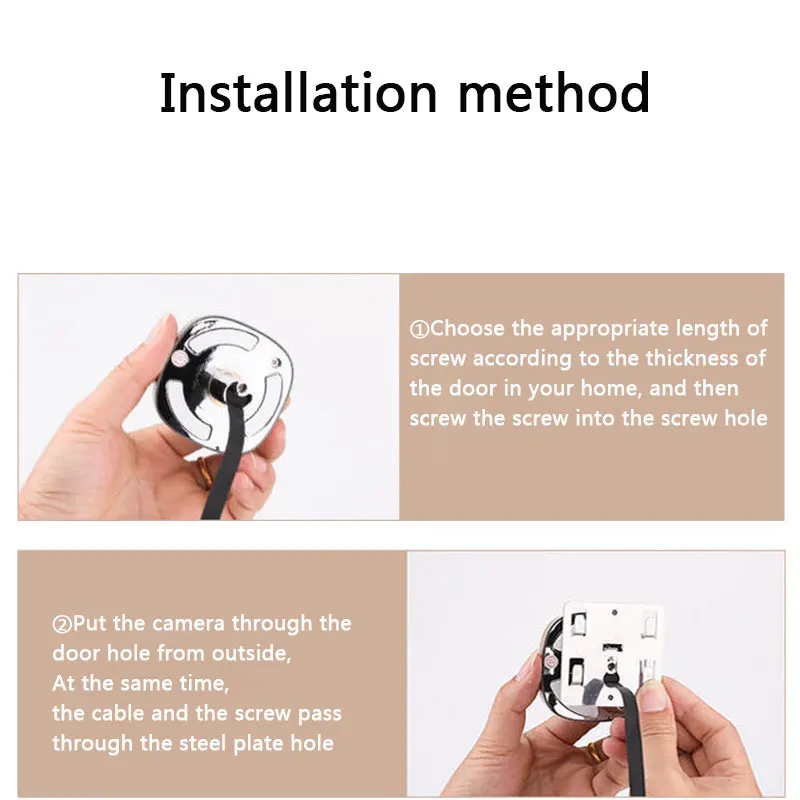 Метод установки1. Выберите соответствующую длину винта в соответствии с толщиной двери в вашем доме, а затем ввинтите винт в отверстие для винта2. Закройте камеру через отверстие двери снаружи, в то же время кабель и винт проходят через отверстие стальной пластины