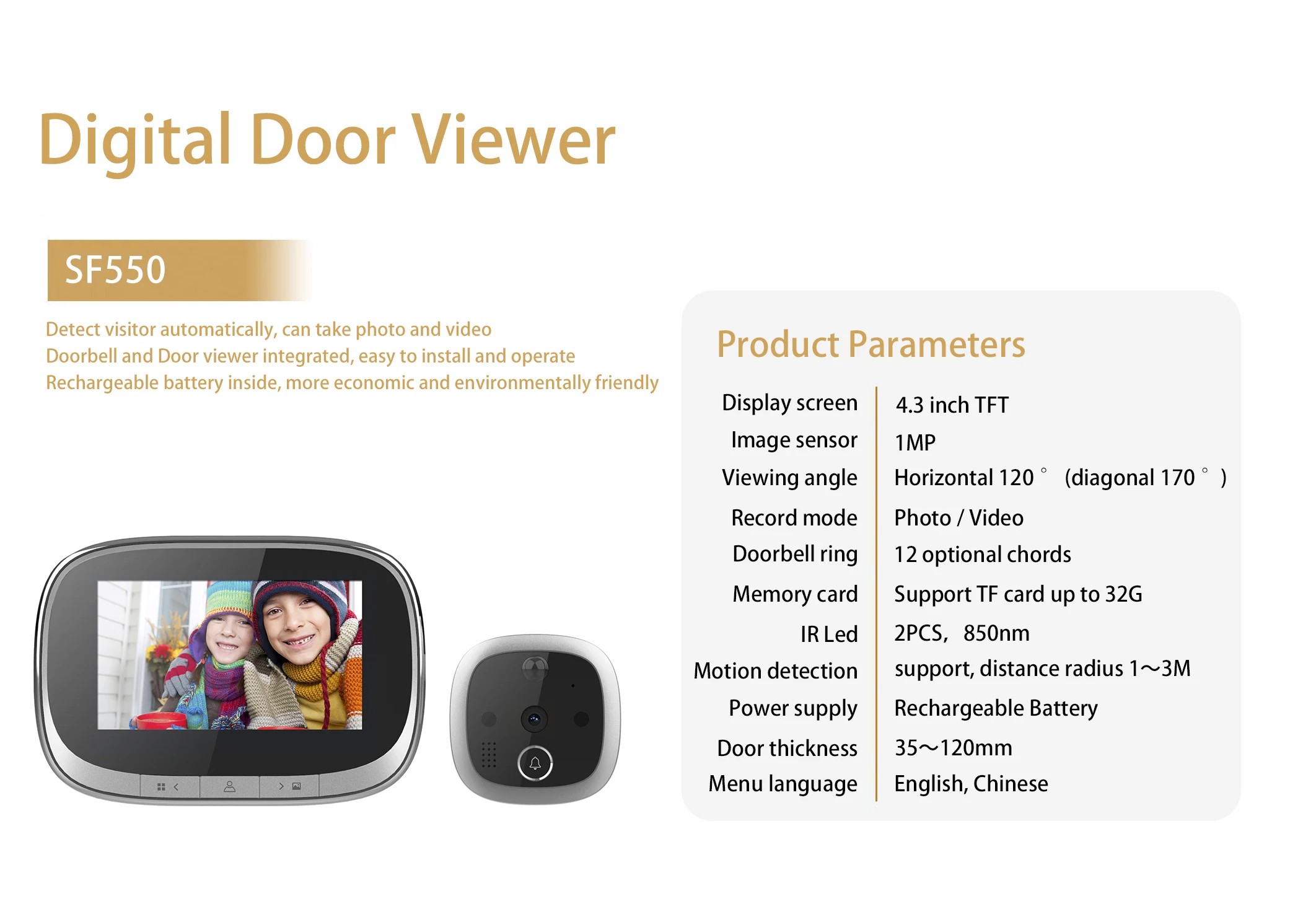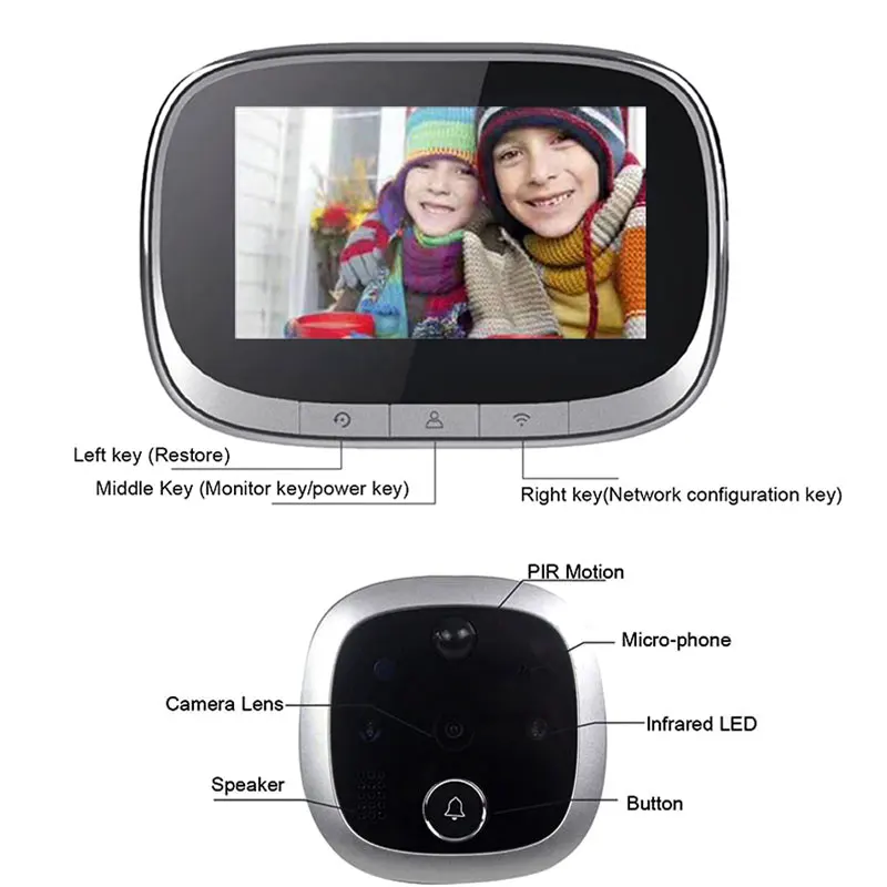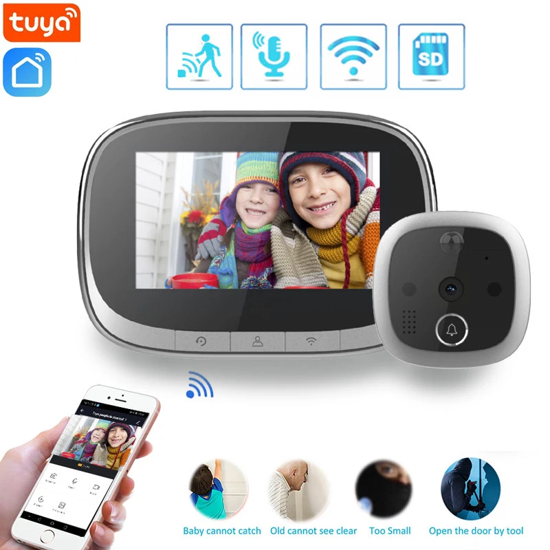 Tuya глазок видео дверной звонок Wifi Дверь просмотра камера Интерком 4,3 ''монитор Обнаружение движения видео-глаз цифровое кольцоПосетитель app-уведомление + 2 способ обсуждения + обнаружение движения app-уведомление (авто фото/видео) + дверной звонок + большой экран (даже дети могут легко увидеть, который находится на открытом воздухе)Популярное приложение Smart Life или Tuyasmart Наслаждайтесь большой и стабильной системой умного дома