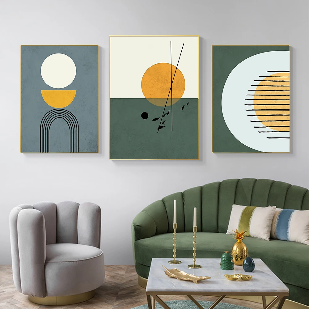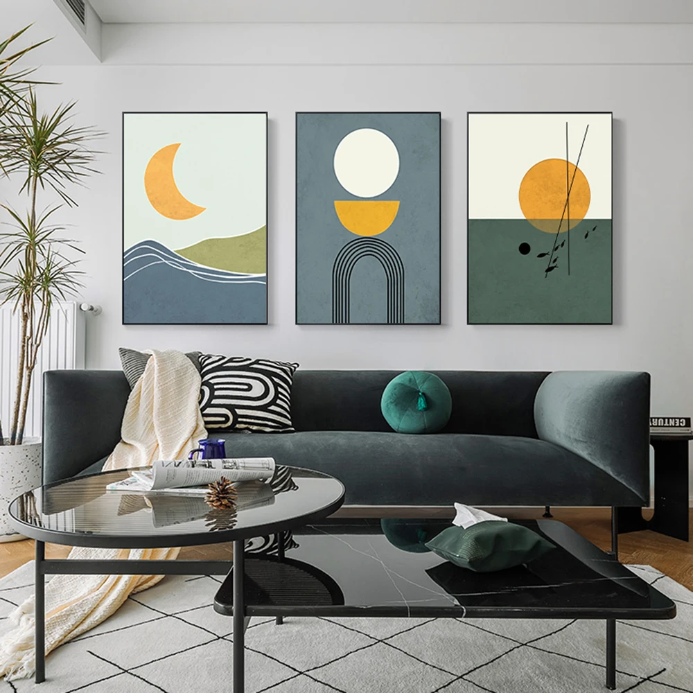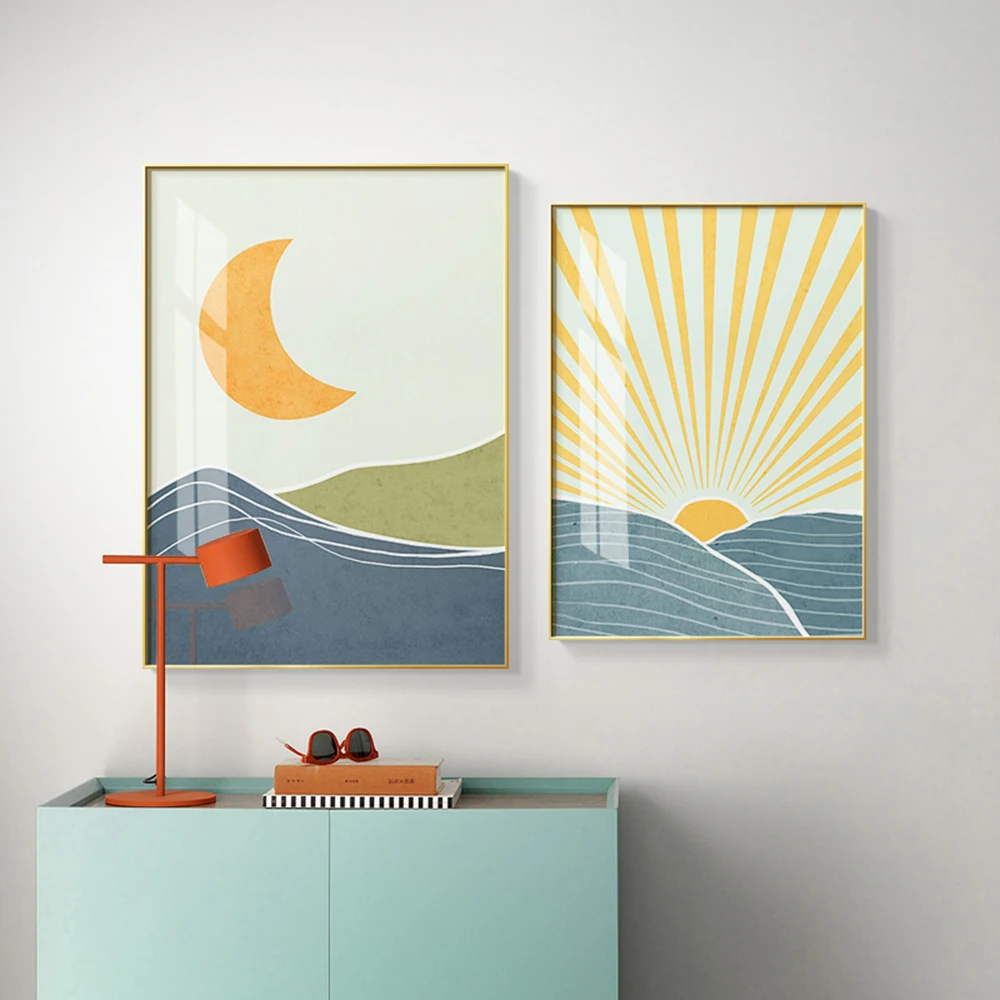 Абстрактные ретро-постеры с изображением солнца, луны, гор и реки, картины на холсте, Геометрические линии, Декор для дома